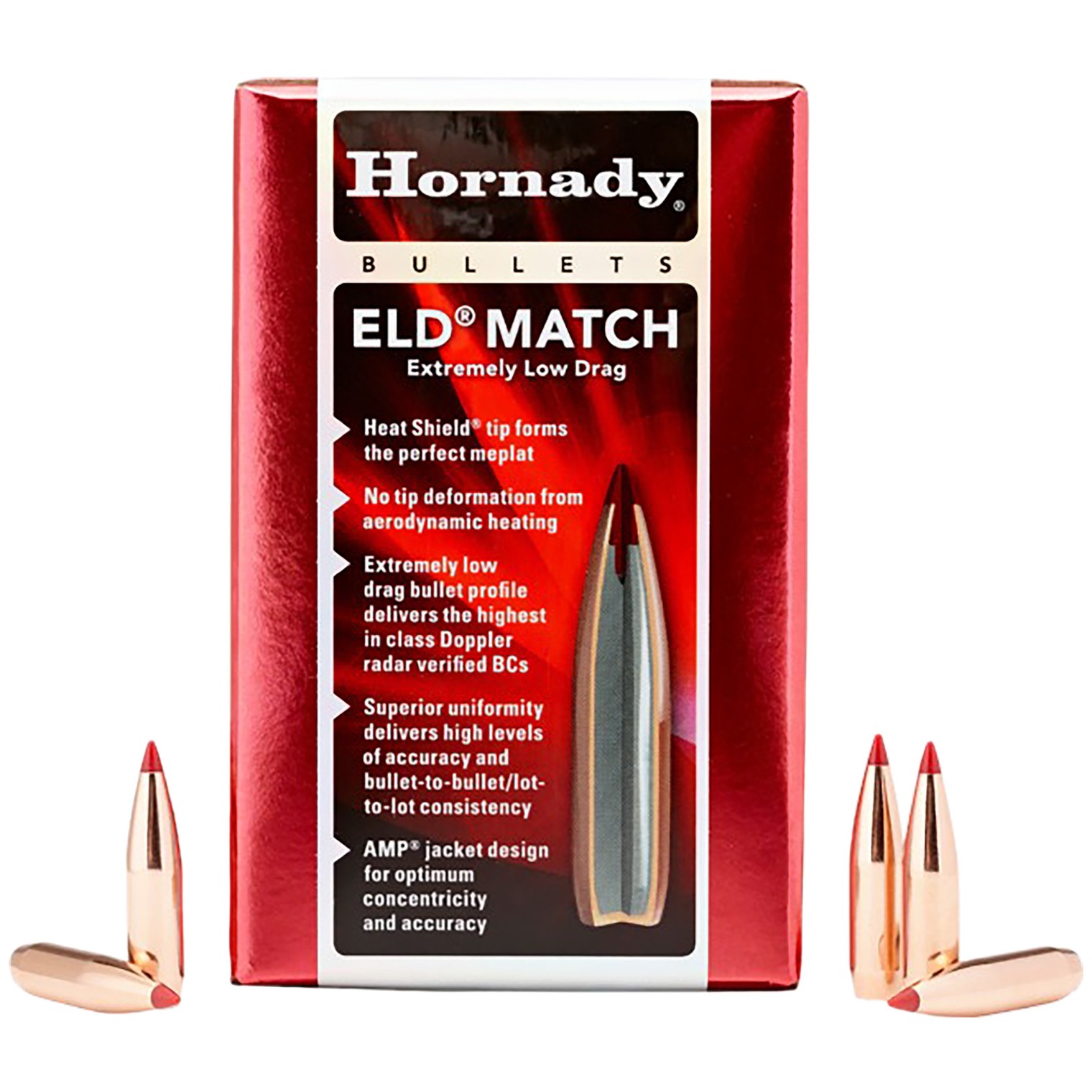 ELD Match (Extremely Low Drag Match) bullets are technologically advanced, enhanced accuracy target bullets featuring Heat Shield tips with the PERFECT MEPLAT (tip point) combined with numerous design features that deliver the highest-in-class ballistic coefficients, superior accuracy and extreme consistency from bullet to bullet.