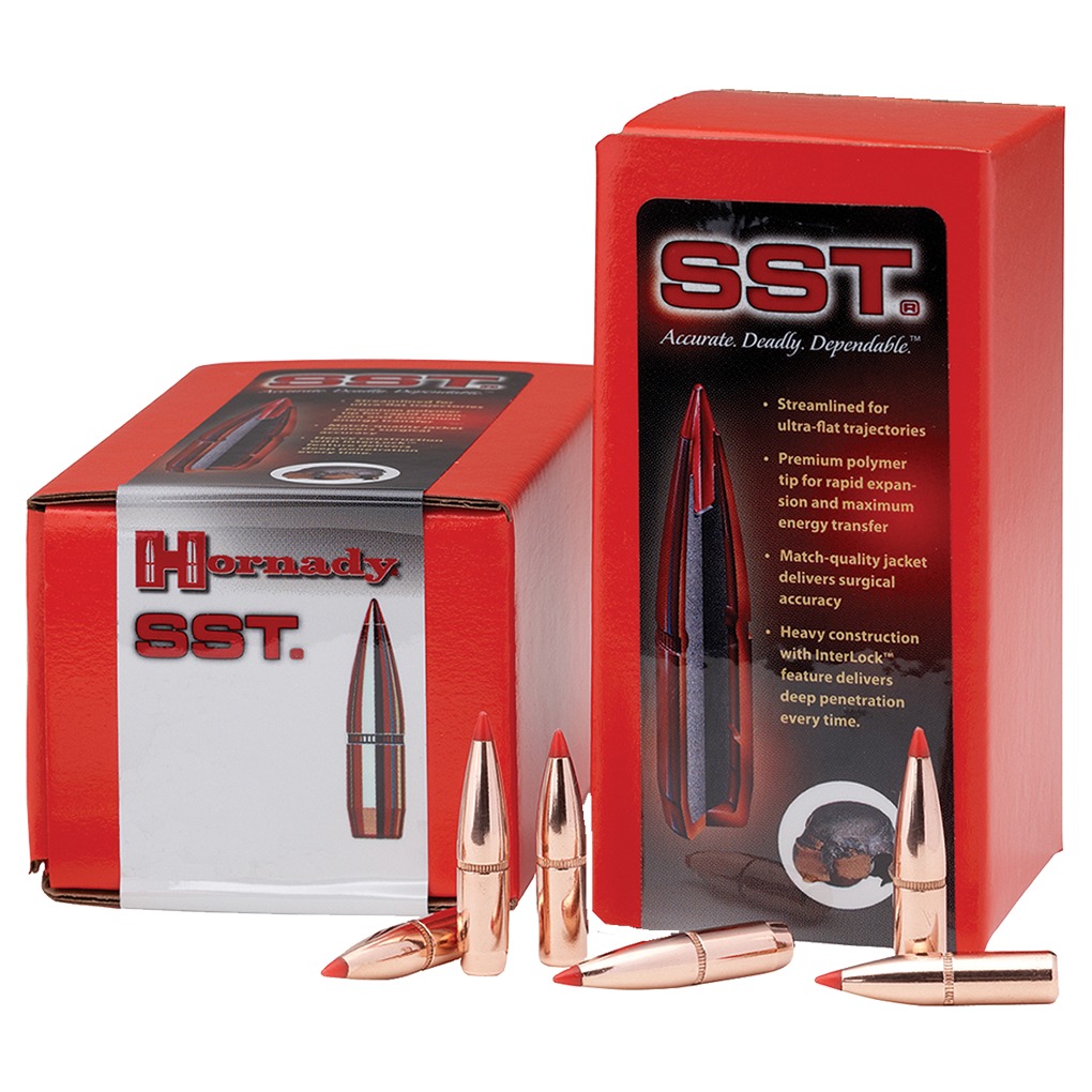 Short for “Super Shock Tip,” the Hornady SST is designed to deliver tremendous shock on impact while expanding quickly and reliably, particularly at higher velocities. Flat shooting and deadly accurate, it’s an ideal bullet for whitetails, as well as most North American game animals from antelope to moose and similar-sized African plains game. The sleek polymer tip increases the ballistic coefficient, while the secant ogive boat-tail profile gives hunters the speed, ballistic efficiency and downrange energy they’re looking for. It utilizes an InterLock Ring which ensures the core and jacket remain locked solid during expansion.