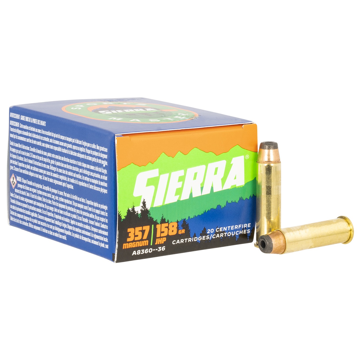 Outdoor Master cartridges utilize innovative components and production processes that deliver an economical cartridge suitable for all purposes. Topped with Sierras proven line of Sports Master Jacketed Hollow Point (JHP) bullets, the Power Jacket provides positive, uniform and controlled expansion by means of specially placed skives in the jacket around the tip of the bullet. Outdoor Master cartridges are loaded with brass casings, making reloading with conventional equipment easy and economical. Packed with hard-hitting terminal performance and the same attention to detail that Sierra is famous for, Outdoor Master will get you outside with confidence. Specifications: 357 Mag 158 gr Jacket Hollow Point Sport Master 20 Per Box