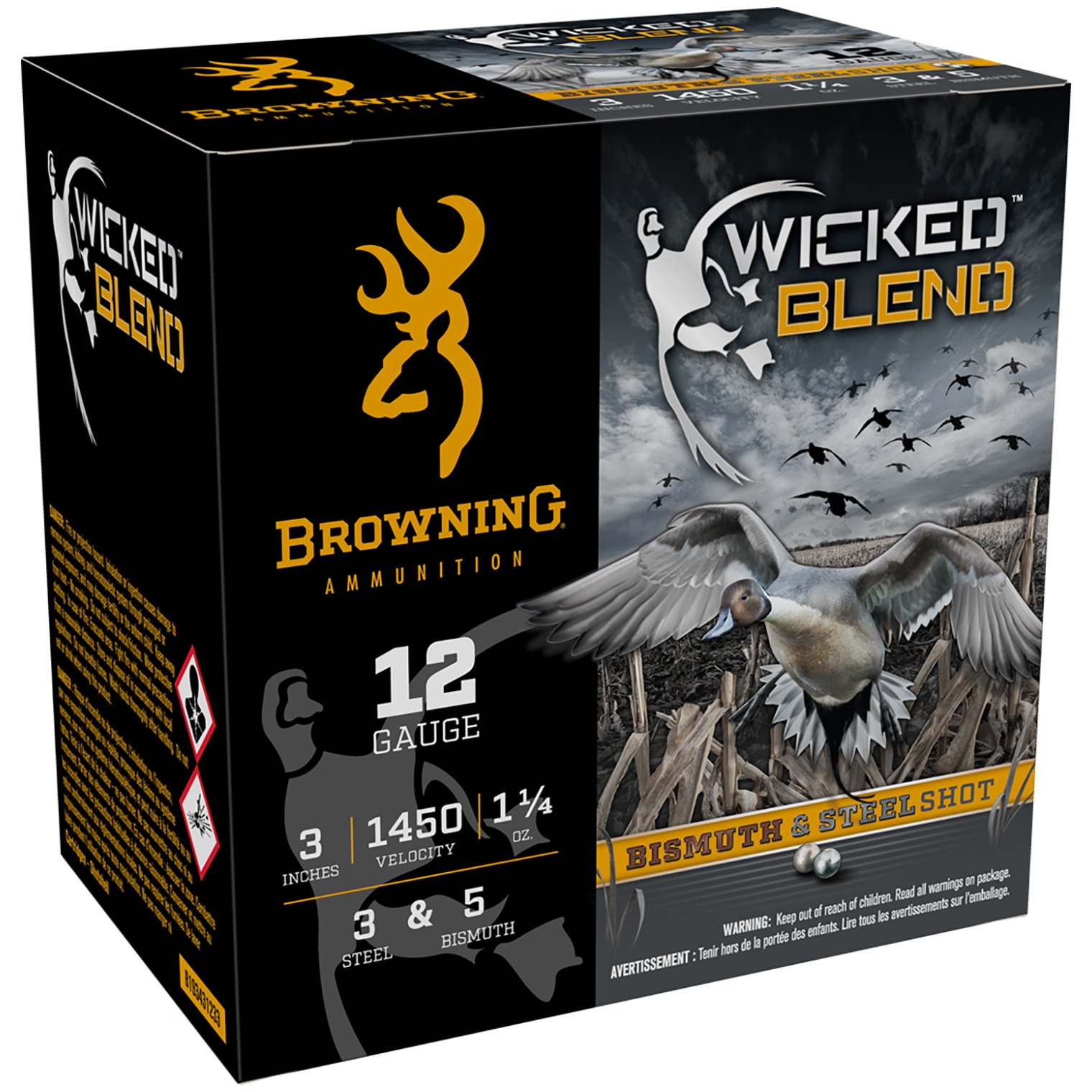 The ultimate waterfowl shotshell for pattern density and knockdown power, Wicked Blend pairs precision round bismuth with precision round steel for a stacked payload and utilizes the Wicked Wad for extra distance. 70% Steel/30% Bismuth