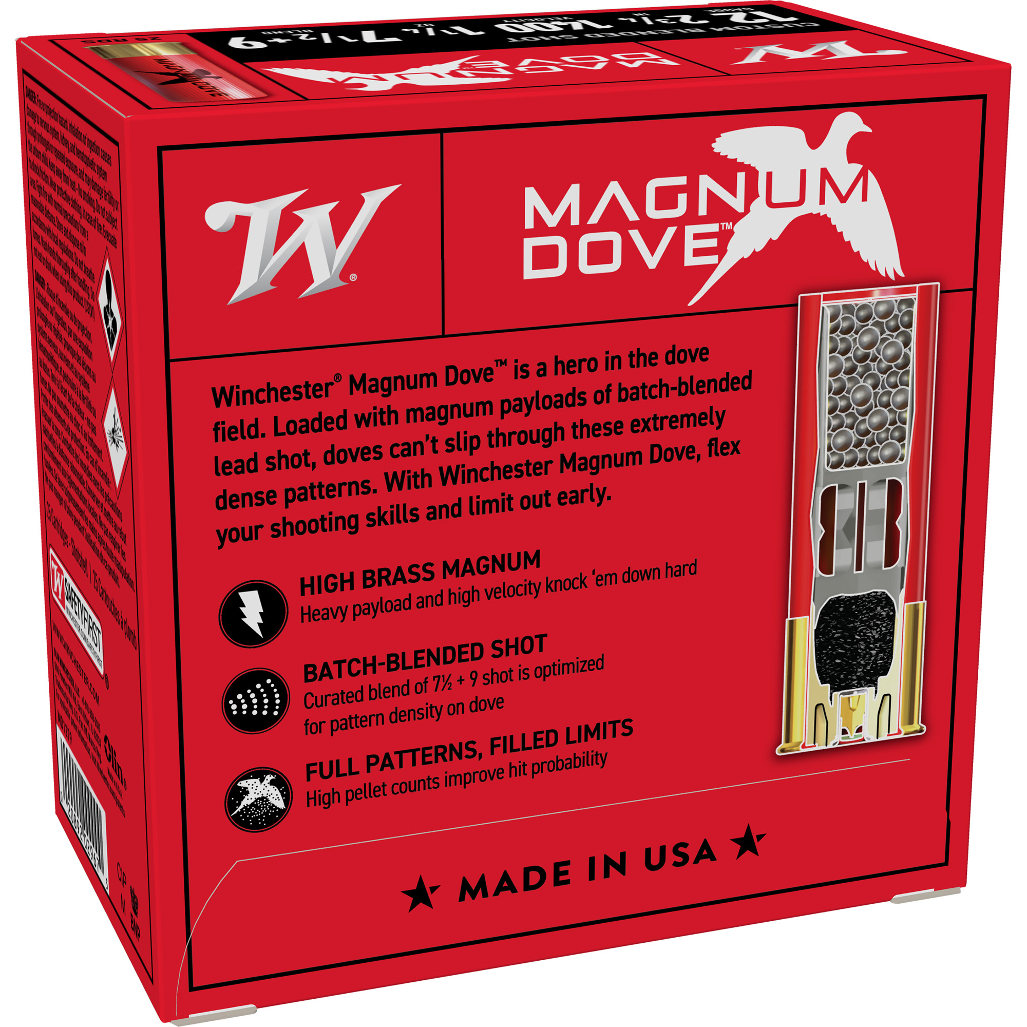 Winchester Ammunition Magnum Dove is a high-performance shotshell engineered specifically for dove hunting. Made in the U.S.A. Magnum Dove features heavy payloads high velocity and dense patterns that set a new standard for dove hunters that want the best ammunition in the field. Magnum Dove shotshells contain a custom blend of #7 1/2 and #9 lead shot. The premium batch-blended shot is optimized for pattern density on doves. - Dove season is a time-honored tradition for many hunters across the country said Kyle Masinelli Senior Director of Product Innovation and Strategy for Winchester. With Magnum Dove we give wingshooters more confidence behind the gun and a competitive edge to fill limits. - Features - Premium batch-blended lead shot- Clean and precisely sized shot provide consistent and dense patterns that doves can’t slip through - High Brass Magnum- High velocity blended payload with #7 1/2 and #9 shot ensures high pellet counts for improved hit probability - Cartridge 12 Gauge - Best Use Upland Dove & Small Game - Quantity 25 Round - Shell Length 2-3/4 - Shot or Slug Type Lead - Shot Size #7-1/2 and #9 - Buffered No - Muzzle Velocity 1400 Feet Per Second - Barrel Type Smooth Bore - Shot Weight 1-1/4 Ounce