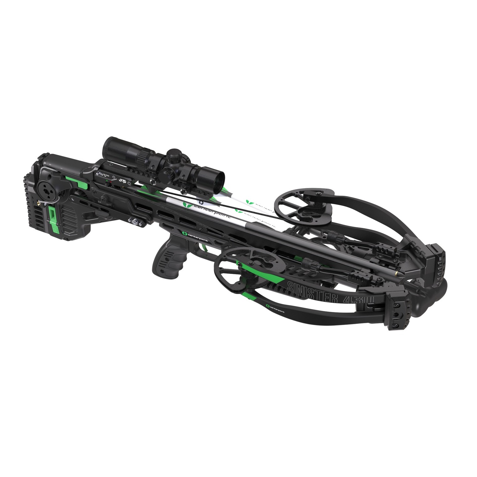 The Sinister 430D De-Cocking Crossbow is a 2025 new offering for CenterPoint Archery. - Features never seen before from CenterPoint include a fully integrated silent cocking system with an auto retracting cocking sled simple and smooth De-Cocking feature and a 1.5-5x32 mm adjustable speed dial illuminated scope. - The Sinister 430D w/ De-Cocking is fully adjustable from its bullpup stock foregrip string stops cheek comb and buttstock allowing you to tailor fit this bow to the user. With 164 foot-pounds of kinetic energy launching arrows at 430 FPS. the Sinister 430D provides an exceptional blend of speed power and maneuverability when hunting from a saddle stand or blind. An aluminum riser CNC machined cam system anti-dry fire technology and a roller retention spring provide outstanding repeatable accuracy and performance shot after shot. - De-Cocking smooth and simple way to decock your crossbow - Fully Integrated Silent Cocking System With Auto Retracting Sled Allows for a worry free cocking system - 1.5-5x32 Speed Ring Scope Dual Illuminated Reticle Speed ring adjustable for multiple FPS and precise aiming points to 100 yards - Fully Adjustable Bullpup Stock For length of pull and cheek alignment the Sinister is designed to fit archers of all sizes - 9 cocked / 13 Uncocked Width For easy handling while in a saddle stand or blind - Roller Arrow Retention SpringConsistent arrow tension for repeatable accuracy shot after shot - Full Accessory PackageIncludes a fully integrated silent crank system rail lube 1.5-5x32 mm illuminated scope and three (3) 20-inch .003 arrows and parallel quiver - SPECIFICATIONS - Arrow Velocity Up to 430 fps - Foot Pounds of Energy (FPE) 164 ft-lbs - Product Weight 9.3 lbs - Length 30 in - System Compound - Limbs Compression Fiberglass Quad Limbs - Stock Style Adjustable - Stock Material Composite