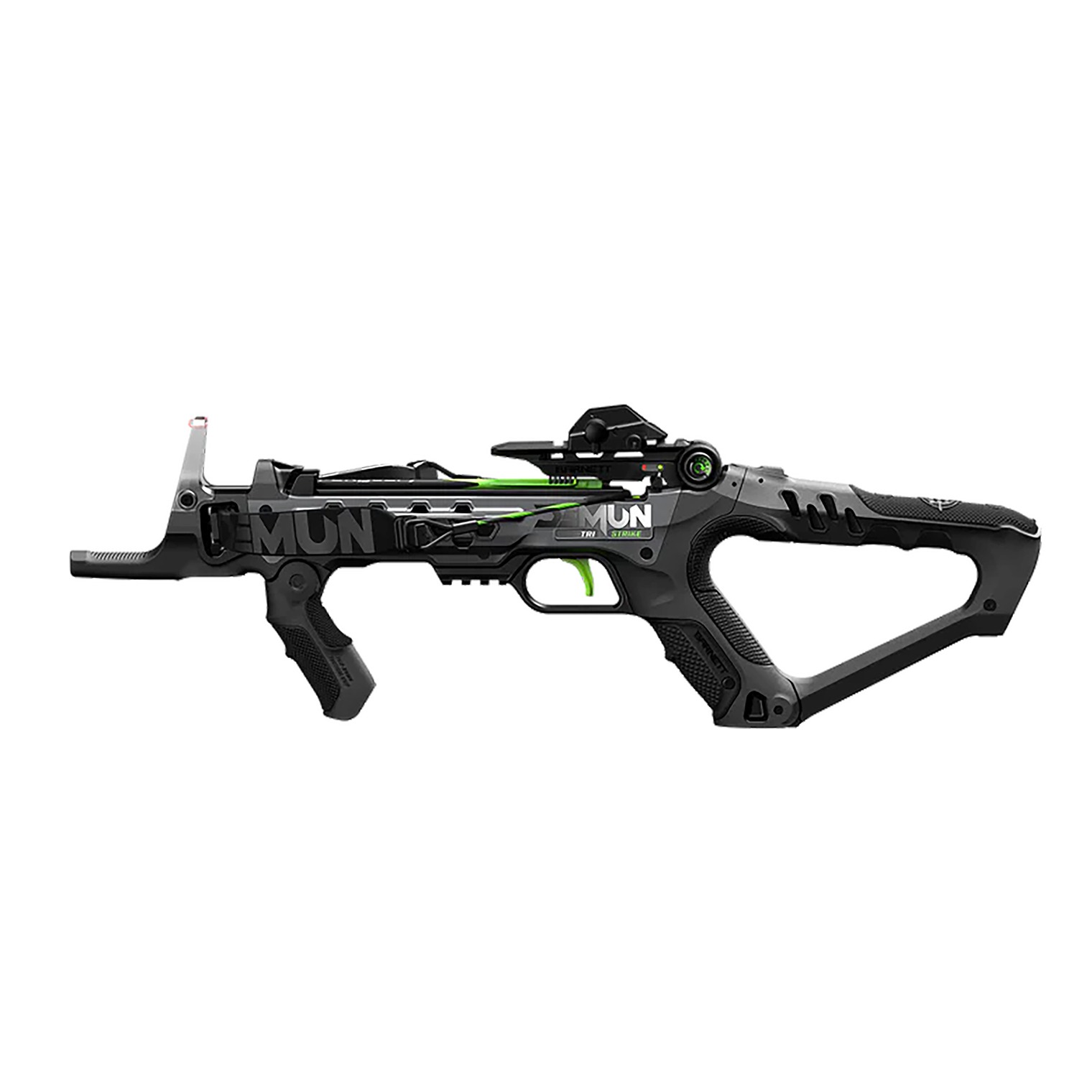 The Demun Tri Strike - a potent combination of power and versatility. A recurve handheld crossbow that combines Barnetts modern day crossbow innovation within a compact, easily maneuverable mini crossbow design. The Tri Strike offers a unique industry first 3-shot repeatable magazine, a smooth, single stage break action cocking mechanism, for quick and efficient reloads and a deadly accurate, adjustable fiber optic pistol sight. The flip down tactical foregrip ensures a rock steady platform as you take aim, poised to release 7 inch 2F Demun Hyperbolts downrange at speeds of up to 180 feet per second.