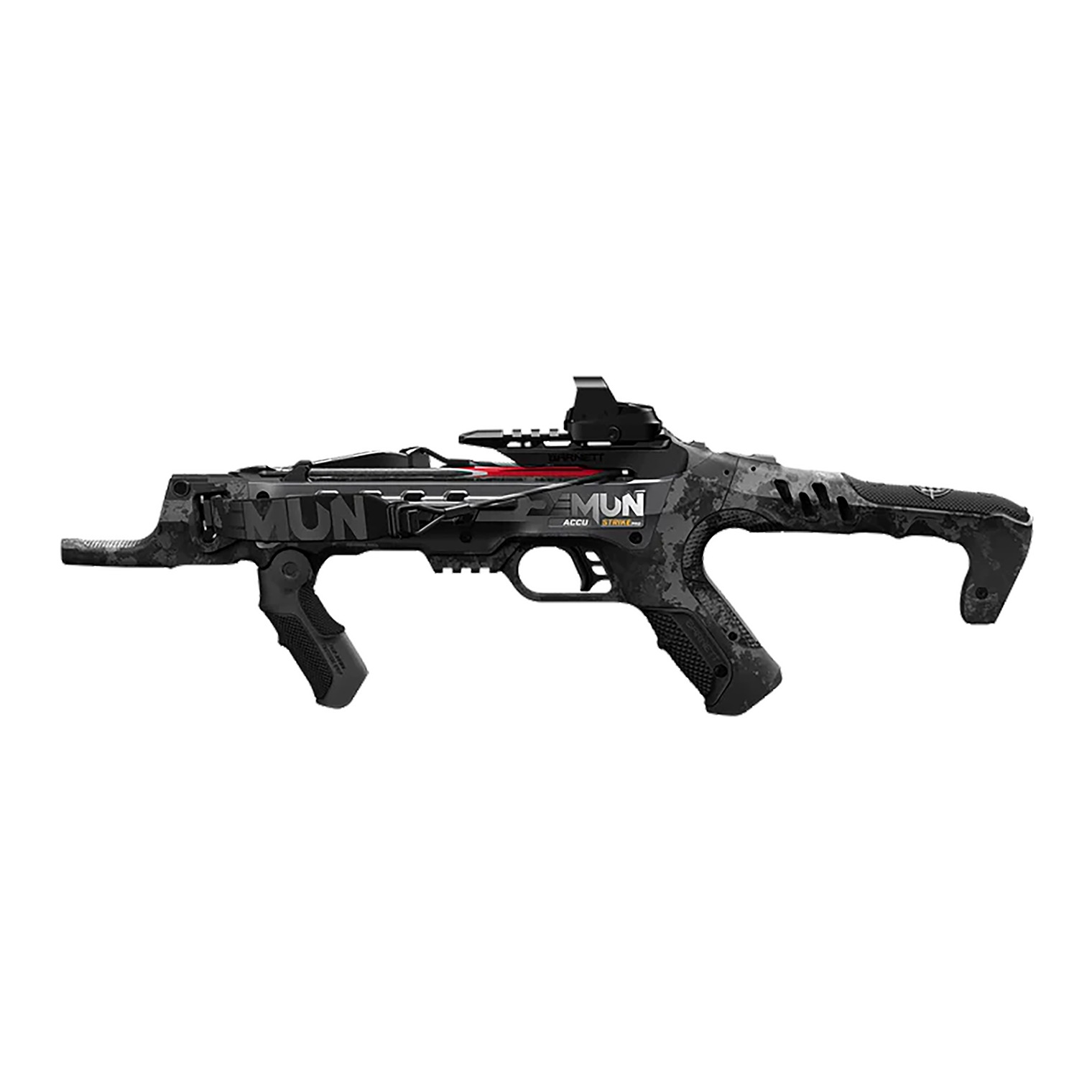 The Demun AccuStrike Pro - a potent combination of power and versatility. A recurve handheld crossbow that combines Barnetts modern day crossbow innovation within a compact, easily maneuverable pistol style design. The AccuStrike offers a patented, two stage break-action cocking mechanism for 50% reduced cocking effort, reinforced parabolic R80 limbs and a deadly accurate, adjustable red/green dot reflex sight. The flip down tactical foregrip ensures a rock steady platform as you take aim, poised to release 7 Demun 3F Hyperbolts downrange at speeds of up to 210 feet per second.