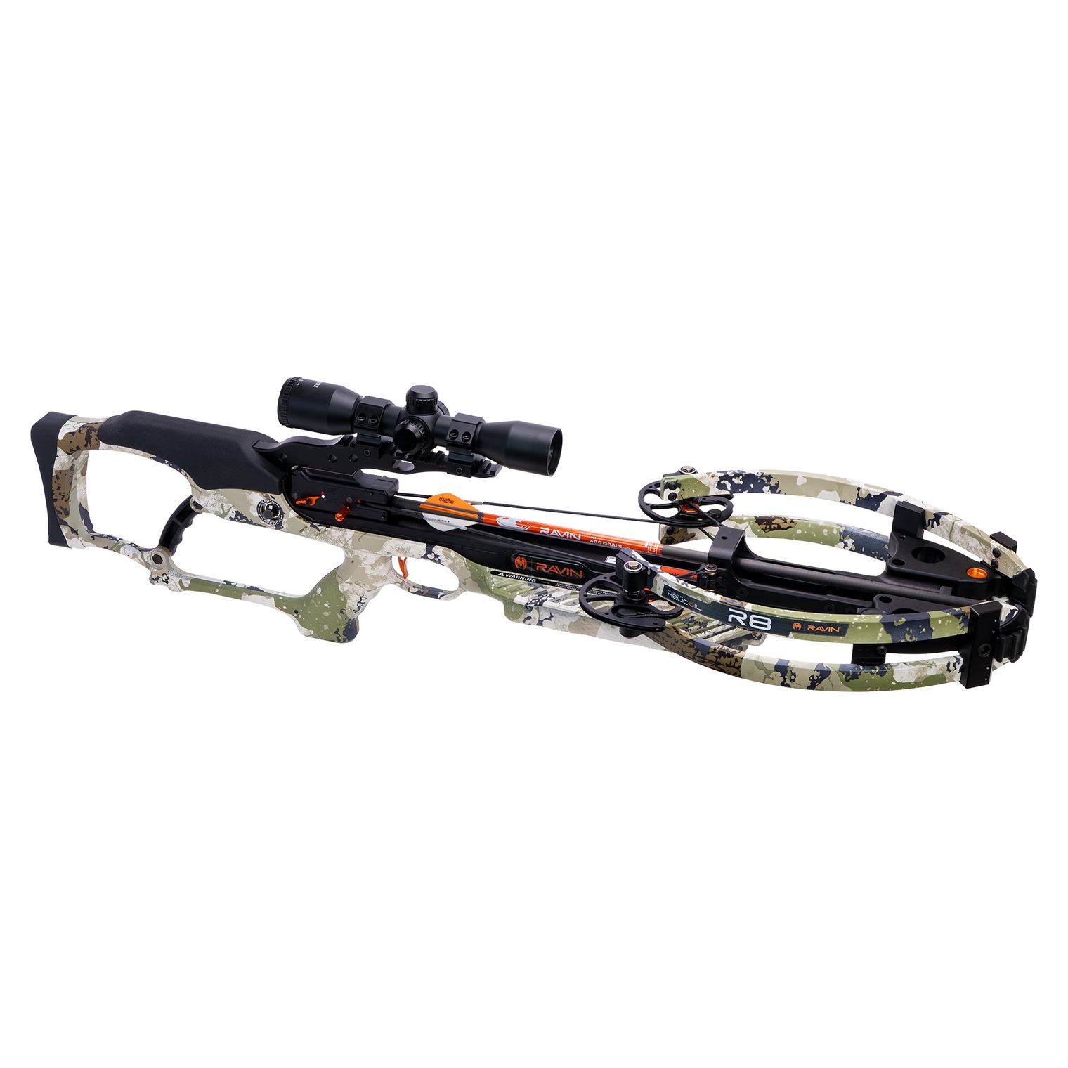 The R8 is built to perform when the moment matters most! Experience the precision power and innovation that defines Ravin at a price that redefines value. The R8 delivers blistering speeds of 420fps and repeatable accuracy that you expect from Ravin. - SPECIFICATIONS - Speed (400 gr.) 420 fps - Kinetic Energy 156 ft-lbs - Product Weight 7.55 lbs - Length 32.5 - Draw Force 12 lbs - Powered By Helicoil Technology - Limbs Quad Limb Composite - Riser Aluminum CNC - Width Axle-Axle 6.5 COCKED / 10.5 UN-COCKED - Stock Style Ambidextrous/Soft Touch - Stock Material Nylon Fiber - Included Optics 3x32mm Illuminated - 100-Yard Illuminated Fixed Power Crossbow Scope - 20-100 yard reticles - 3x32 Fixed Power - Red & green illumination - Fog shock recoil and waterproof - Fully coated lenses - INCLUDES - HeliCoil Technology - Fully Assembled/Pre-Tuned - 3 Ravin .003 Arrows & Field Points (400 Grain Total) - 1 Removable Draw Handle - 1 Quiver/Mounting Bracket - 100 Yard Illuminated Scope - Built-In Cocking Mechanism - Anti-Dry Fire/Auto Safety - Built-in Sling Mounts