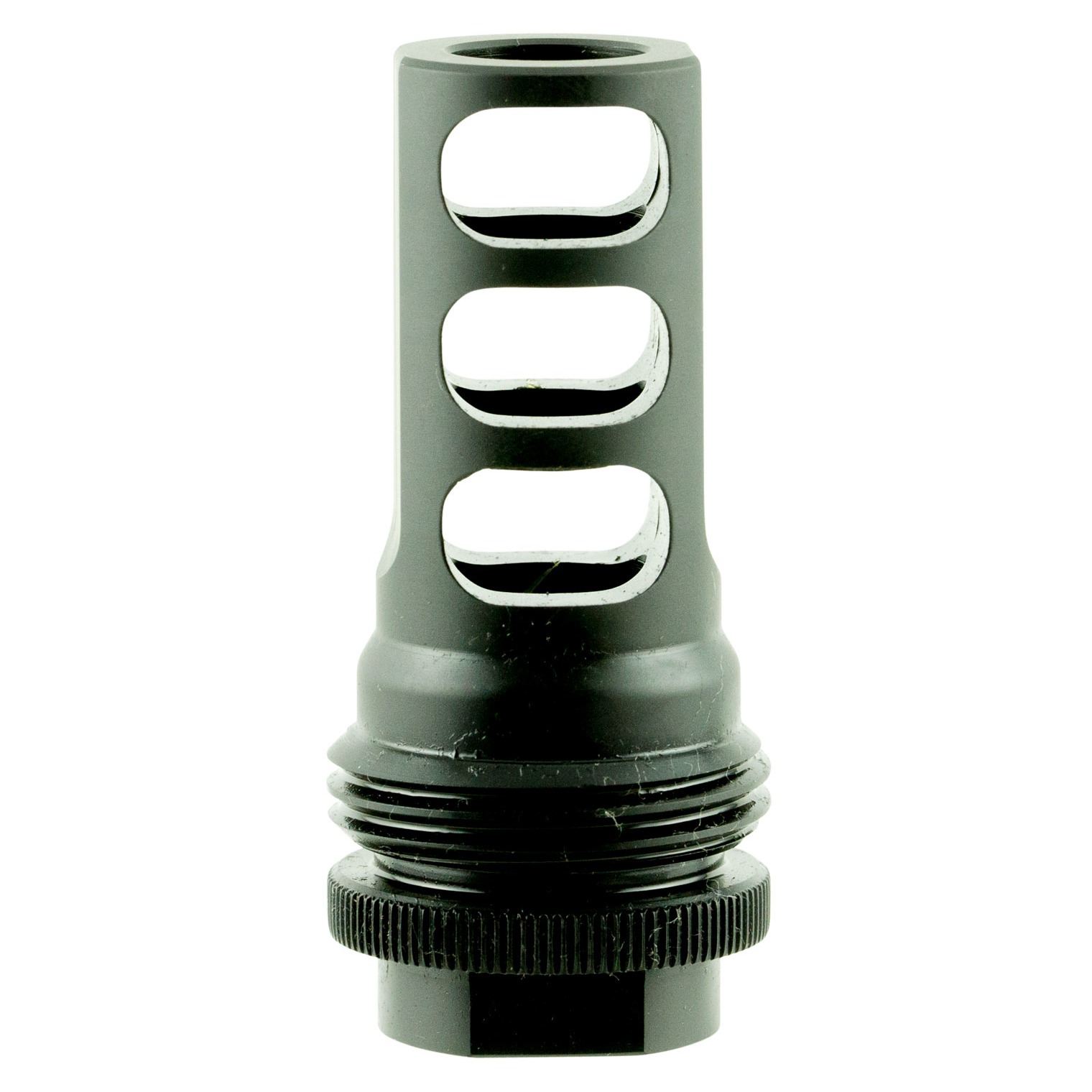 This 3-port muzzle brake is compatible with all SilencerCo ASR Mounts. It offers quick and easy one-hand-on, one-hand-off attachment and detachment. The 3-port design effectively reduces felt recoil and muzzle climb. Each ASR muzzle brake comes with a shim set and rocksett for easy application.