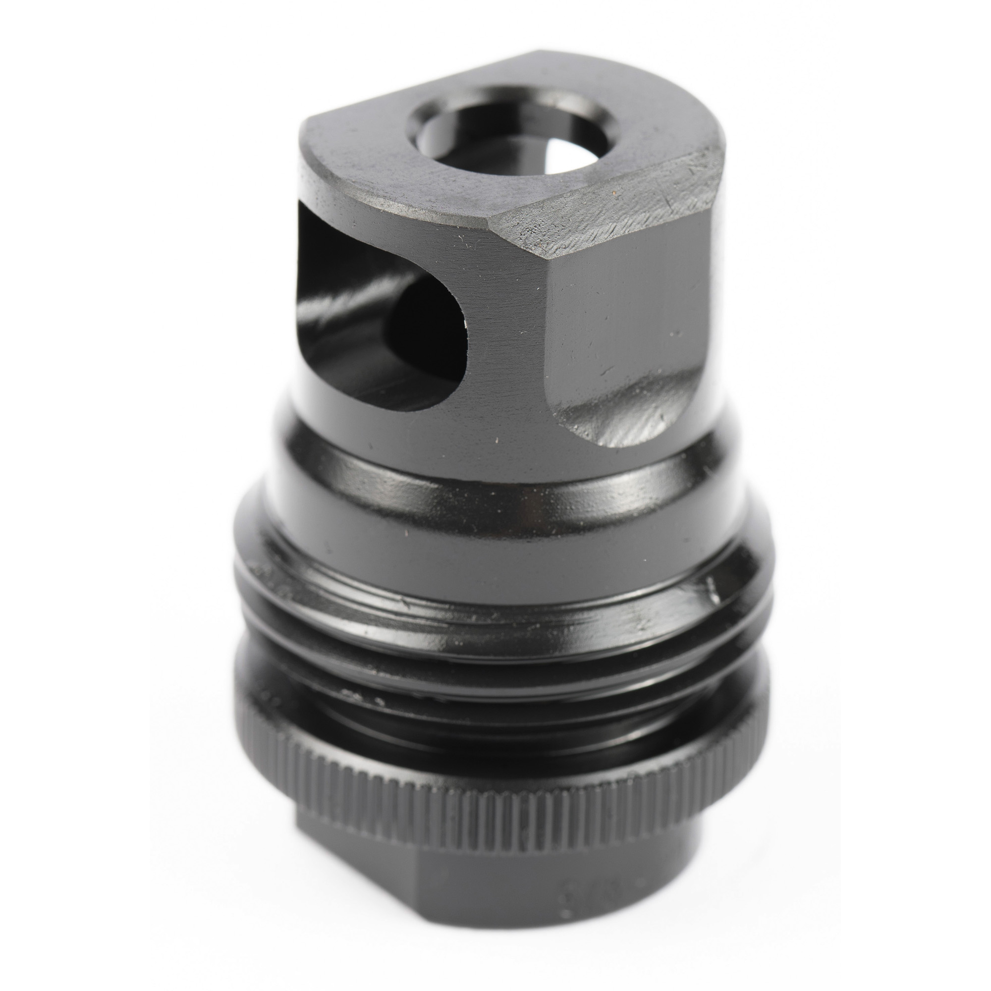 The single port muzzle brake is compatible with all SilencerCo ASR Mounts. It offers quick and easy one-hand-on, one-hand-off attachment and detachment. The 1-port design effectively reduces felt recoil and muzzle climb. Each ASR muzzle brake comes with a shim set and rocksett for easy application.