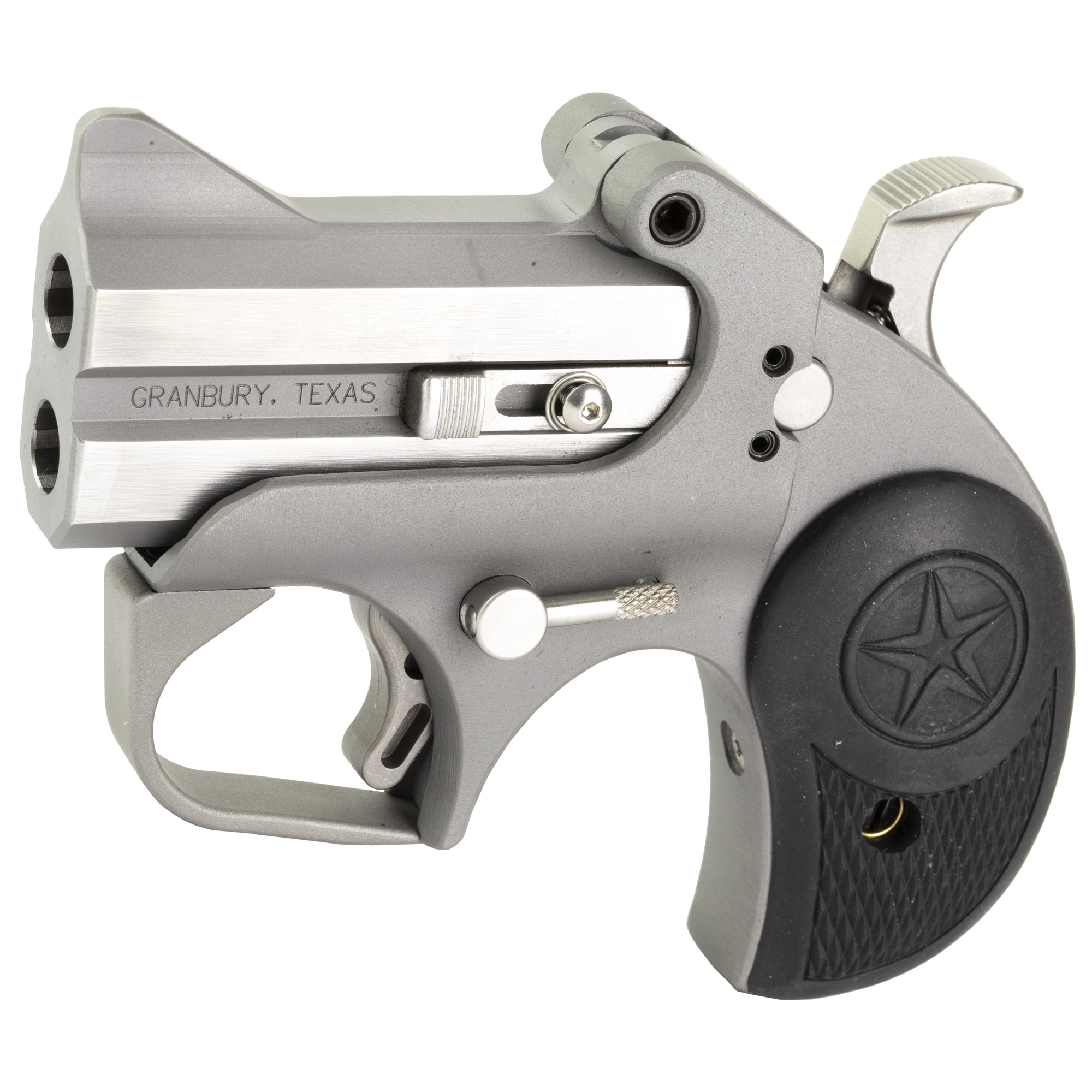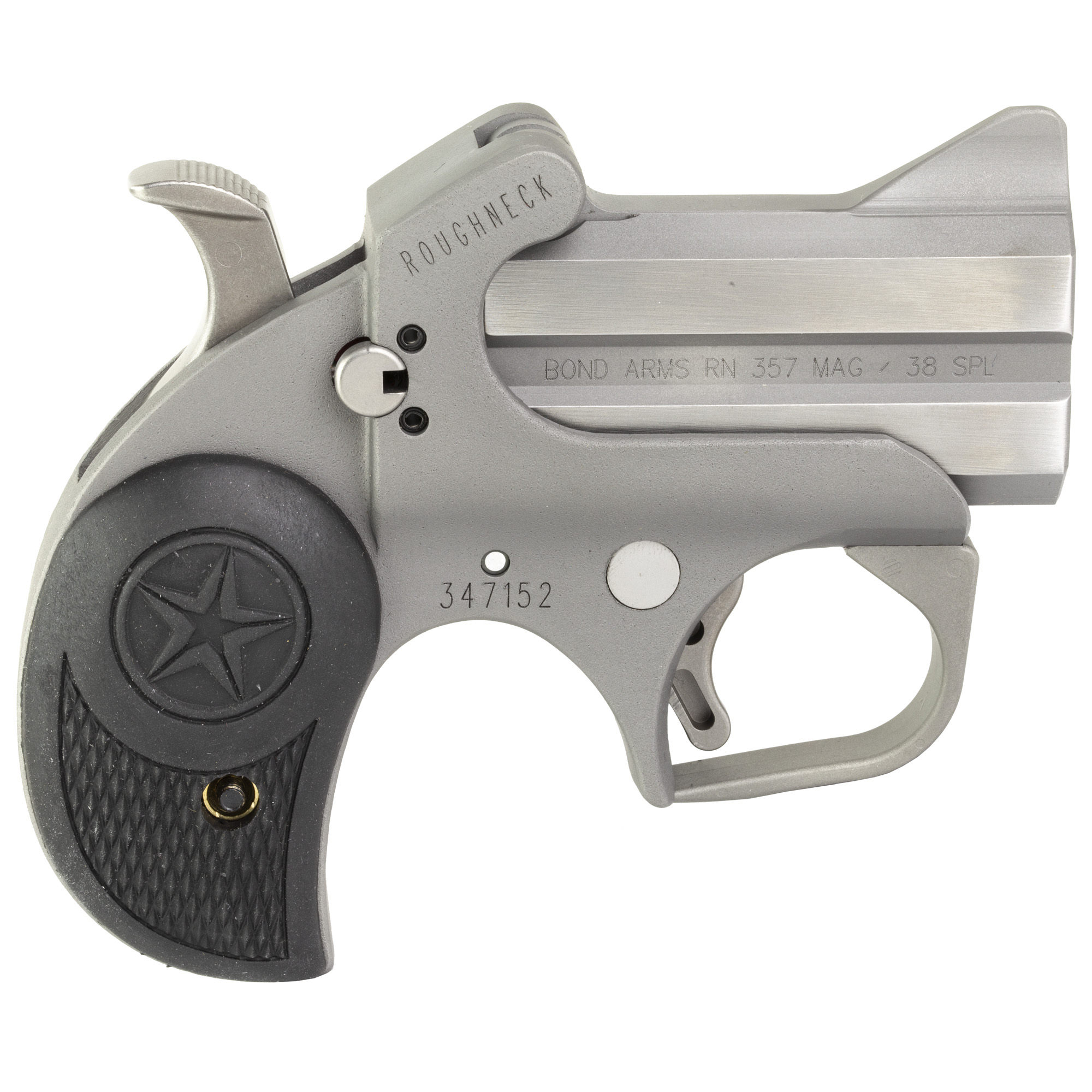 The compact, Roughneck is built with a 2.50” barrel and chambered for 357 Mag/38 Special. It features a stainless steel double-barrel and frame; compatible with all standard Bond Arms barrels; spring-loaded; cammed locking lever; retracting firing pins; cross-bolt safety and has a patented rebound hammer.