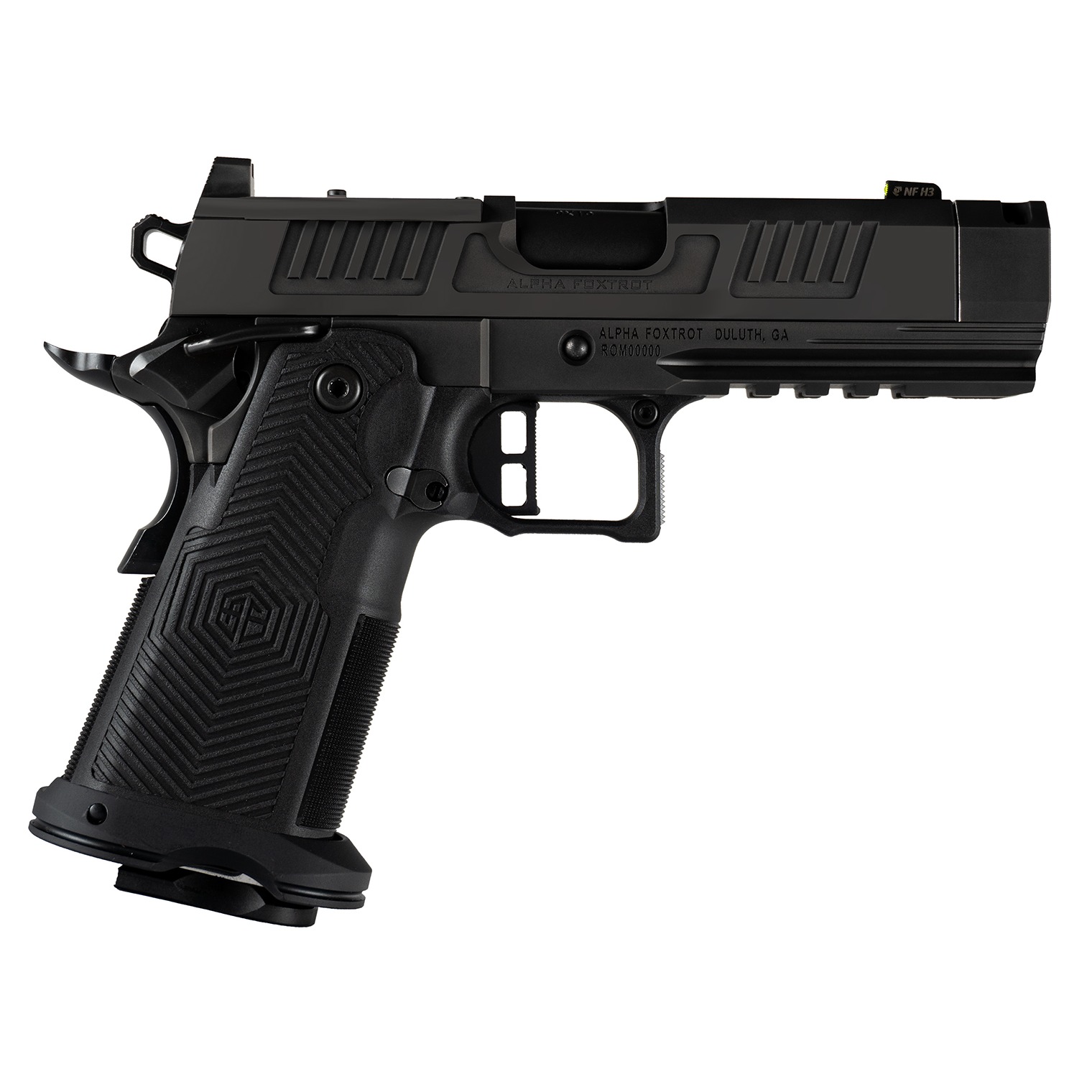 The AF1911 Romulus is hammer fired featuring a SUS416 black polished DLC finish on the frame and slide; Bull ramped, threaded, compensated barrel; injected polymer grip module; extended beavertail, Double Stack magazine; glowing night sights; extended slide release: flared magwell; Picatinny rail; RMSC optics cut; ambi thumb safety. Includes MOS adapter plate, RMSC and RMR plate, 17rd and 20rd magaine.