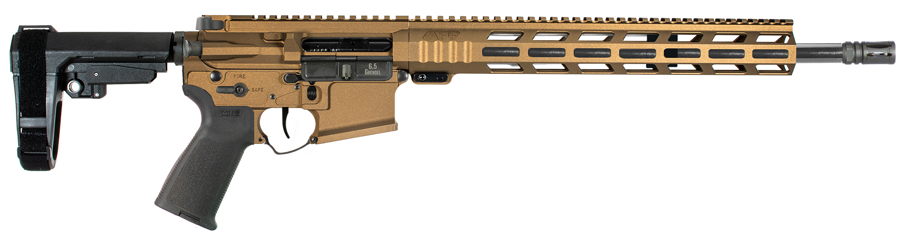 14.5 4150CM Nitride-Coated Barrel (1:8 Twist) - .750 Mid-Length Gas System - Diamond-Honed Nitride M16 BCG (6.5 Grendel Bolt Face) - APF 4.5 lb. Drop-In Trigger - APF Adjustable Gas Block - SBA3 Pistol Brace - Magpul MOE Grip - APF 13 M-Lok Handguard - Billet Receiver Set - Ambidextrous Controls - Caliber/ Gauge: 6.5 Grendel - Barrel Length: 14.5 4150CM Nitride- Coated Barrel (1:8 Twist) - Action: Semi-Auto - Front Sight: Rear Sight: None - Color: Burnt Bronze - Finish: Cerakote - Material: Aluminum - Hand: Right
