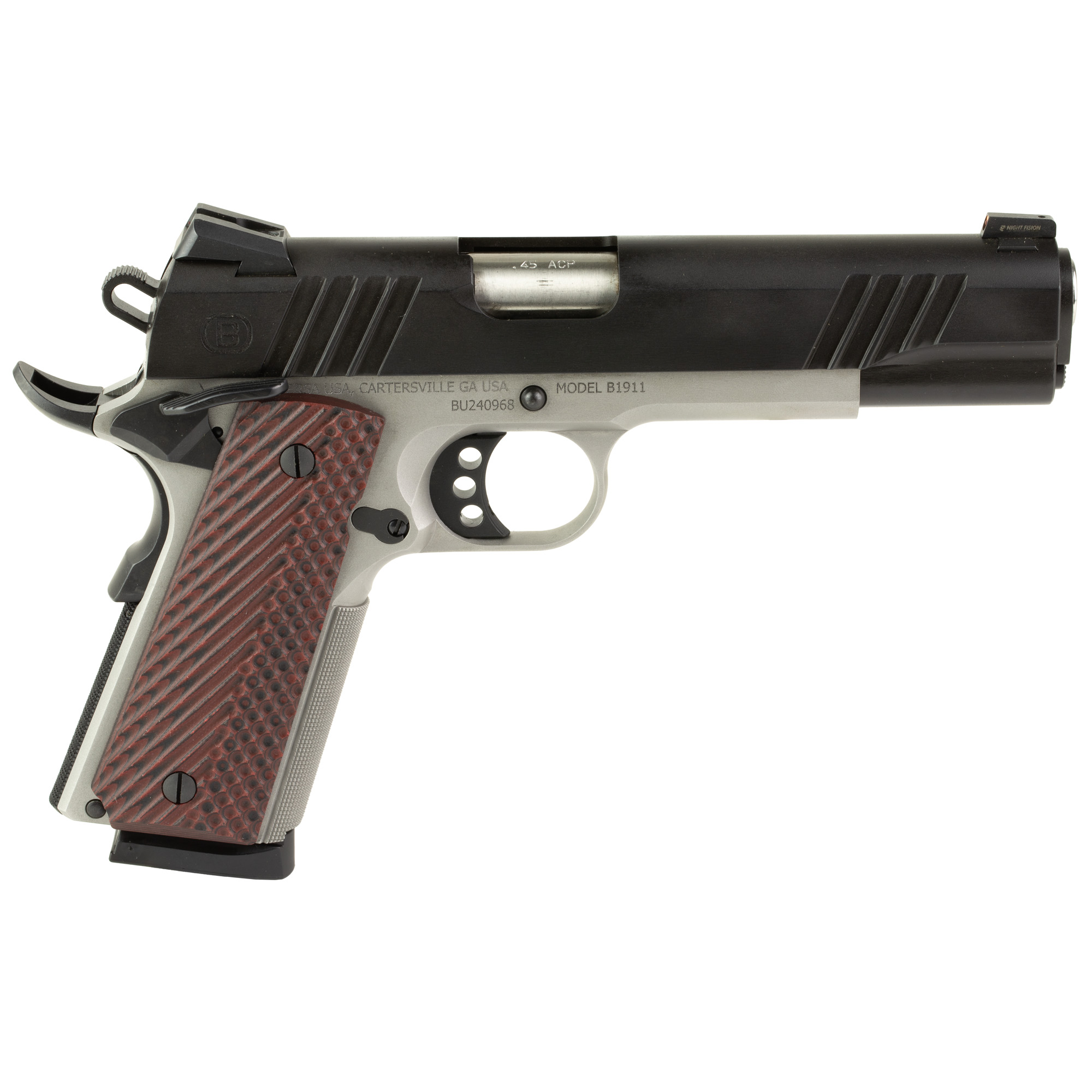 Bersa B19117050BMBC B1911 Full Size Frame 45 ACP 8+1 5” Stainless Steel Barrel, Stainless Serrated Steel Slide, Black Stainless Steel Frame w/Beavertail, Rosewood Grip, Ambidextrous
