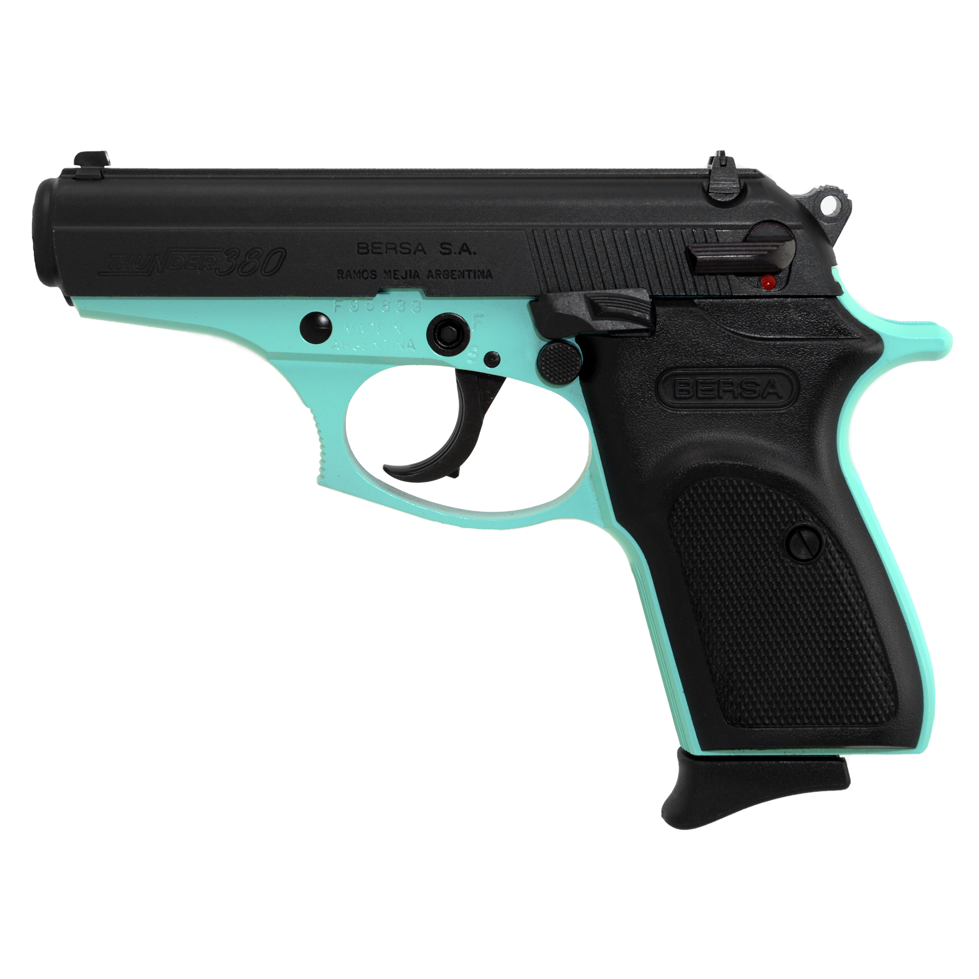 Bersa, Thunder, Double Action/Single Action, Semi-automatic, Metal Frame Pistol, Compact, 380ACP, 3.5” Barrel, Alloy, Black/Robin’s Egg Blue/AKA Tiffany Blue, Polymer Grips, Fixed Sights, 8 Rounds T380BLM8