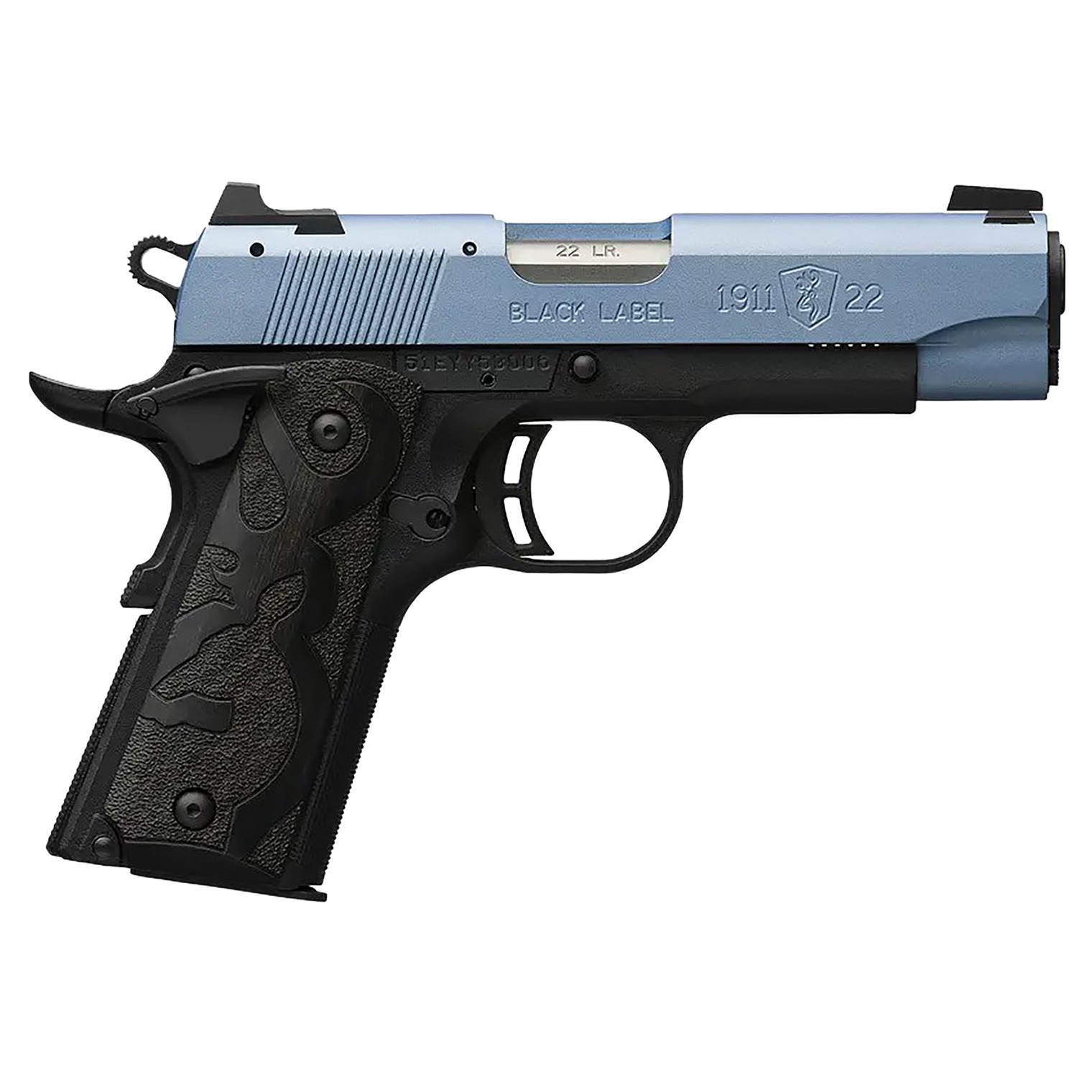 Browning 1911-style, autoloading 380 ACP pistol with a Cerakote finish on the stainless steel slide. Metal 3-dot sights, black stippled laminated wood grips with Buckmark logo, extended ambidextrous manual safety, beavertail grip safety and skeletonized hammer. Includes magazine and pistol rug.