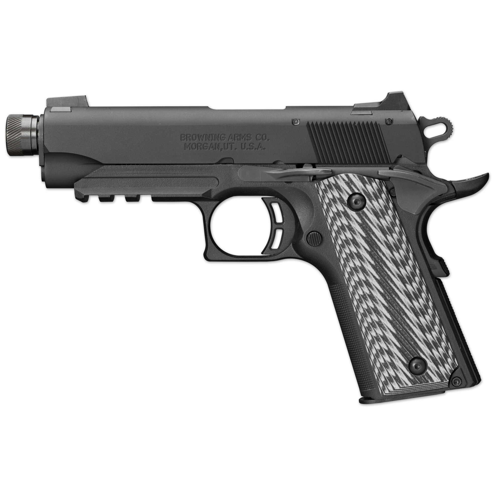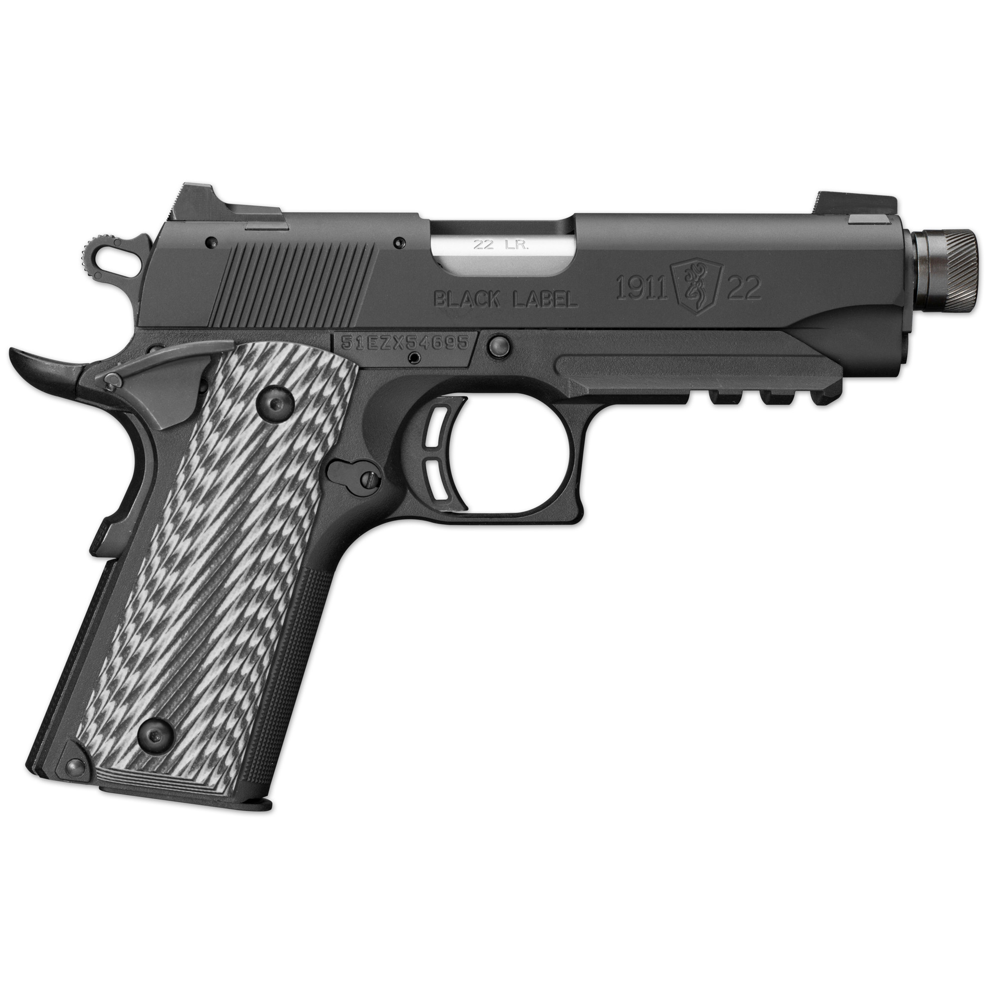 The Browning 1911-22 Black Label Compact Suppressor Ready w/Rail is built with a high-strength, compact and lightweight polymer frame. Featuring a 1913 Picatinny rail; black & gray G-10 grips with angled serrations; extended ambidextrous thumb safety; Beavertail grip safety; Commander hammer; extended slide release and Dovetail Combat 3-dot sights. Includes magazine and pistol rug.