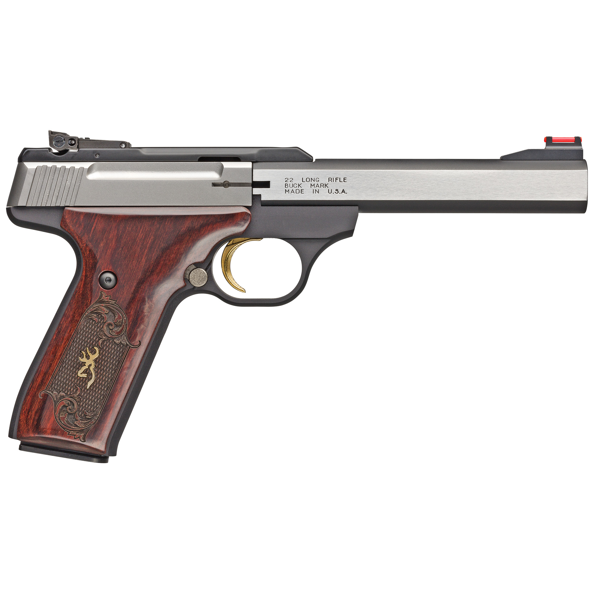 Browning Buck Mark rimfire pistol crisp single-action trigger, hand reamed chamber, target crowned barrel and finely adjustable target sights mean the Buck Mark comes ready for fun straight from the box. The slide features built-in recess and raised side panels for better grip and a convenient manual slide release. It has grooves plus slide cocking “ears” at the rear making racking the slide back even more convenient. The Buck Mark utilizes a large manual safety and mag release adjacent to the trigger guard. This Medallion model features an aluminum alloy frame with a matte black finish, stainless steel, slab-sided barrel and slide and Rosewood checkered/engraved grip. Includes pistol rug and magazine.