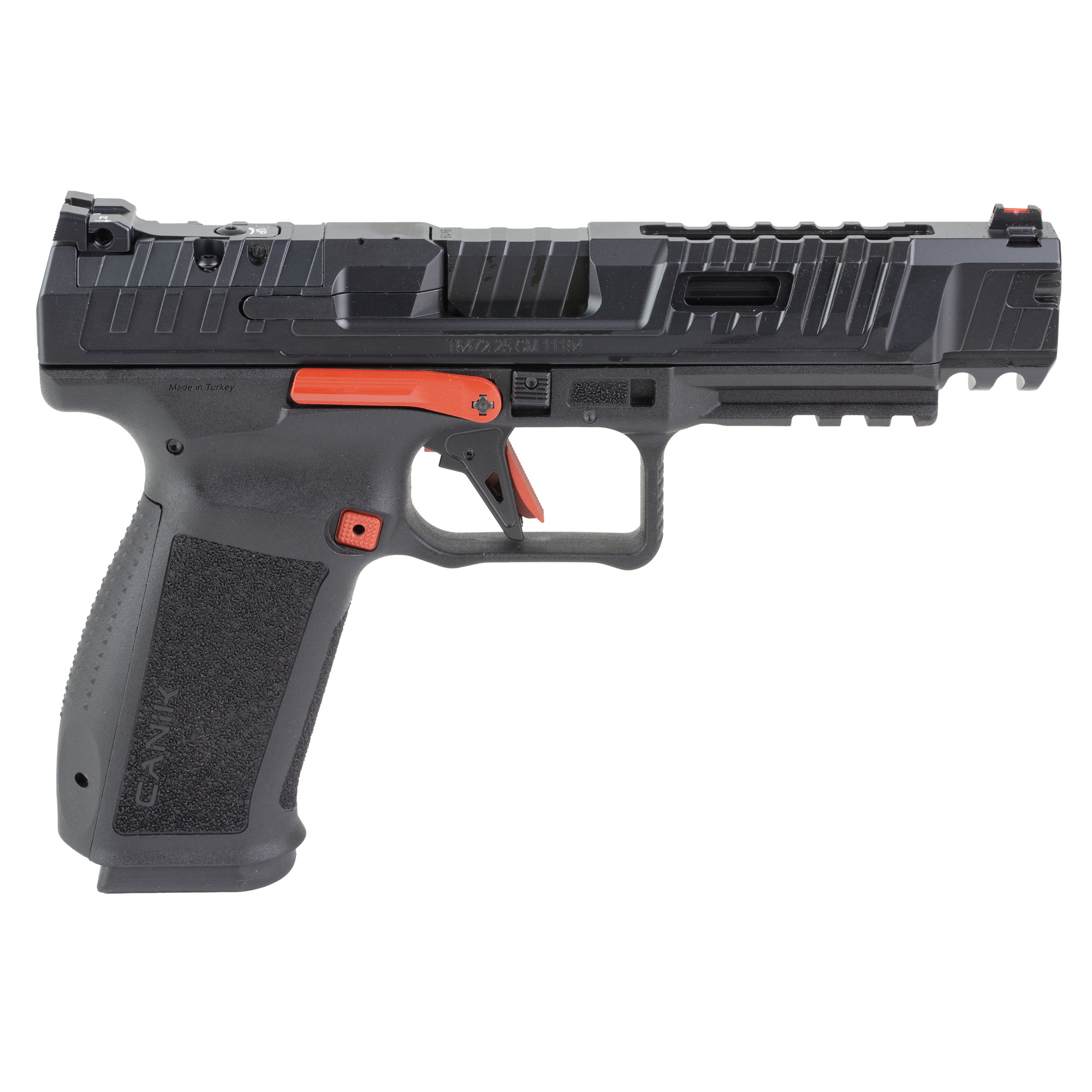 With its specifications the Canik SFx Rival can compete in IDPA, IPSC and USPSA without restrictions. The SFx Rival features adjustable fiber optic sights; a lightened 90 degree diamond cut aluminum flat trigger; reversible magazine release; ambidextrous slide release; aggressively serrated and ported slide; 1913 Picatinny rail on frame; external mag-well; interchangeable backstraps; double undercut trigger guard; ergonomically redesigned beavertail; aggressive grip texturing and a completely modular setup. Includes two magazines, magazine E-Z Loader, gun lock, three backstraps, four optic plates, Canik Punch/Took kit, cleaning kit, two aluminum mag base plates, additional fiber optic, three mag release extensions and manual.