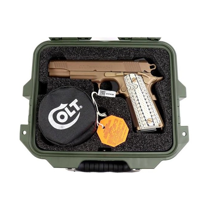 Action: SA - Caliber: .45 ACP - Capacity: 7rd - Barrel: 5 - Sights: Novak Tritium Night Sights - Frame: Stainless Steel Desert Sand Cerakote - Slide: Stainless Steel Desert Sand Cerakote - Grips: G10 - Length: 8.5 - Weight: 2.8 lbs - Stainless Steel Frame - Desert Sand Cerakote Finish - Novak Tritium Night Sights - Integral Picatinny Rail System - Colt continues to take its battle and time proven M1911 pistol and adapt it to meet the changing requirements of its customers with its Close Quarter Battle Pistol. Where quality and workmanship are demanded Colt once again meets and exceeds the expectations of its customers. This handgun is outfitted with new and exciting features. The Picatinny Rail offers the versatility to adapt tactical light and laser accessories to the receiver of the CQBP making it a tactical pistol easily adaptable to any military.