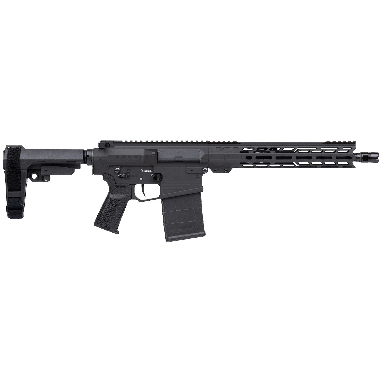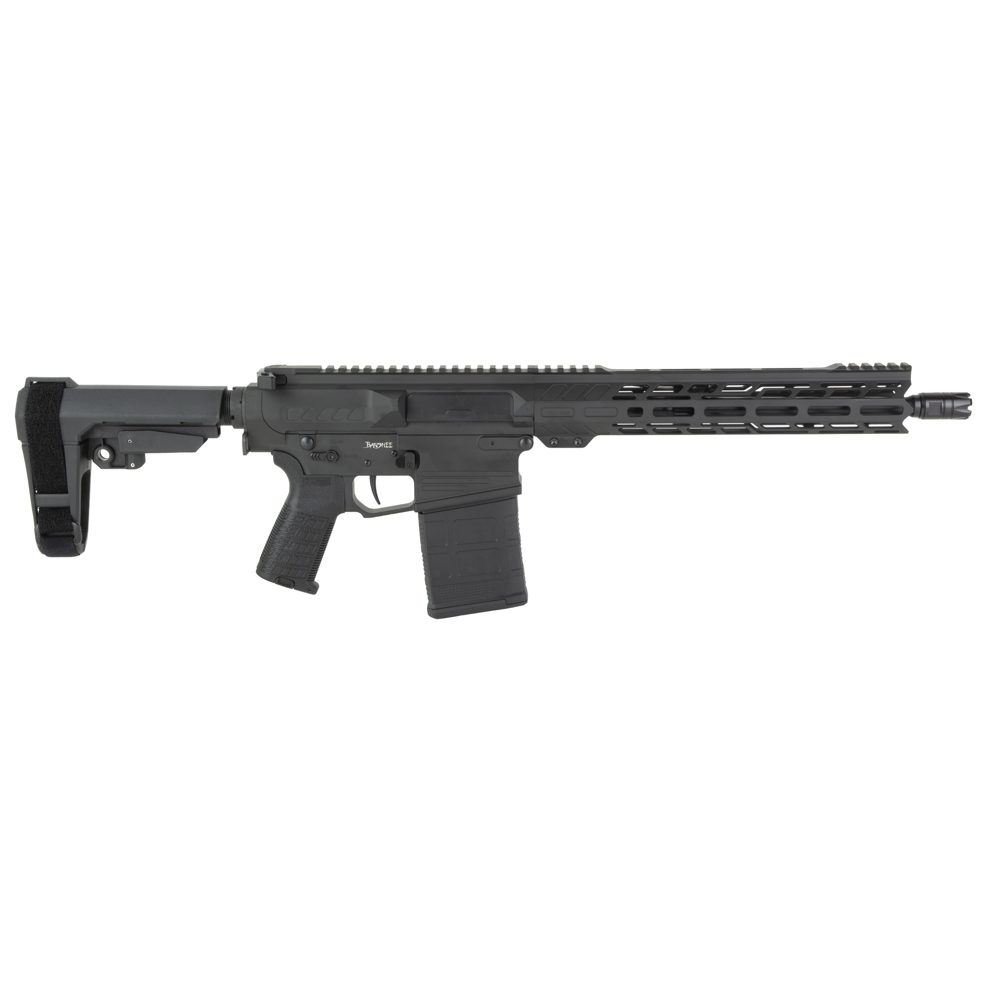 The BANSHEE series represents the most innovative AR pistols and SBRs available today. From the quick deploying RIPBRACE, to the stylized receivers and EML handguards, every BANSHEE is tailor-made to be the personal defense weapon you can always depend on. With full length M-LOK slots on both sides and the bottom of the handguard as well as M-LOK between the top picatinny rail sections, you’ll always have enough space for those must have accessories. Includes Magpul 20rd PMAG.
