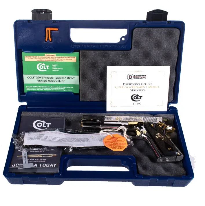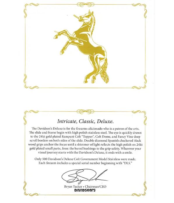 Davidson’s Deluxe Colt Government Model in stainless steel—one of the rarest and most intricately detailed Colt 1911s ever produced. This limited edition masterpiece is 1 of 500 and features an absolutely stunning combination of high-polish stainless, 24kt gold inlay, and intricate engravings that elevate it beyond a simple firearm. What’s more, this beauty is chambered in the highly sought-after 38 Super and comes with a 5” National Match barrel for unparalleled precision.