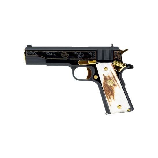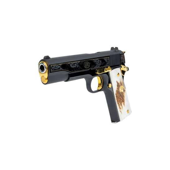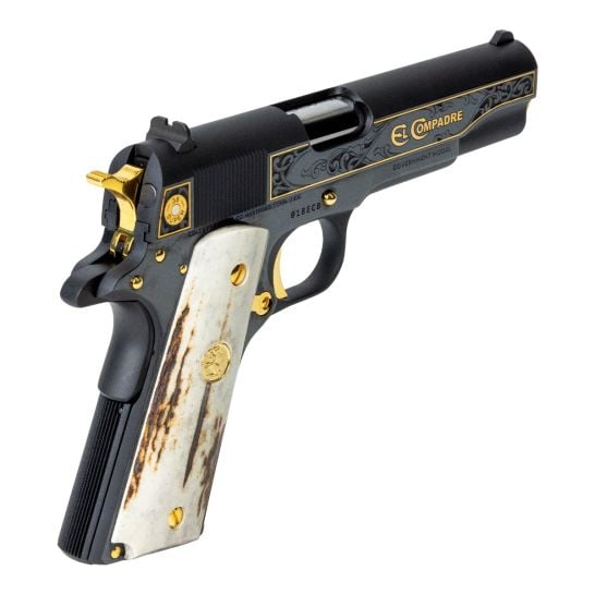 The Colt 1911 El Compadre Limited Edition with only 500 made the is crafted with precision and passion, this iconic handgun boasts a 9+1 capacity, ensuring you’re always ready for action. With a 5-inch rifled barrel and an overall length of 8.5 inches, it strikes the perfect balance between accuracy and maneuverability. Safety is paramount, featuring both thumb and grip safety mechanisms, granting you peace of mind in any situation. Adorned with exquisite scroll engraving and gold inlays, this masterpiece stands out from the crowd. The steel frame finished in classic blue exudes elegance and durability, while the blade front sight and fixed rear sight guarantee pinpoint accuracy. Weighing 35 ounces, it’s light enough for extended use without sacrificing control. The service hammer and flat mainspring housing further enhance its performance and handling. Trust in the Colt 1911 El Compadre to deliver unparalleled reliability and precision with every shot, making it the ultimate choice for discerning shooters.