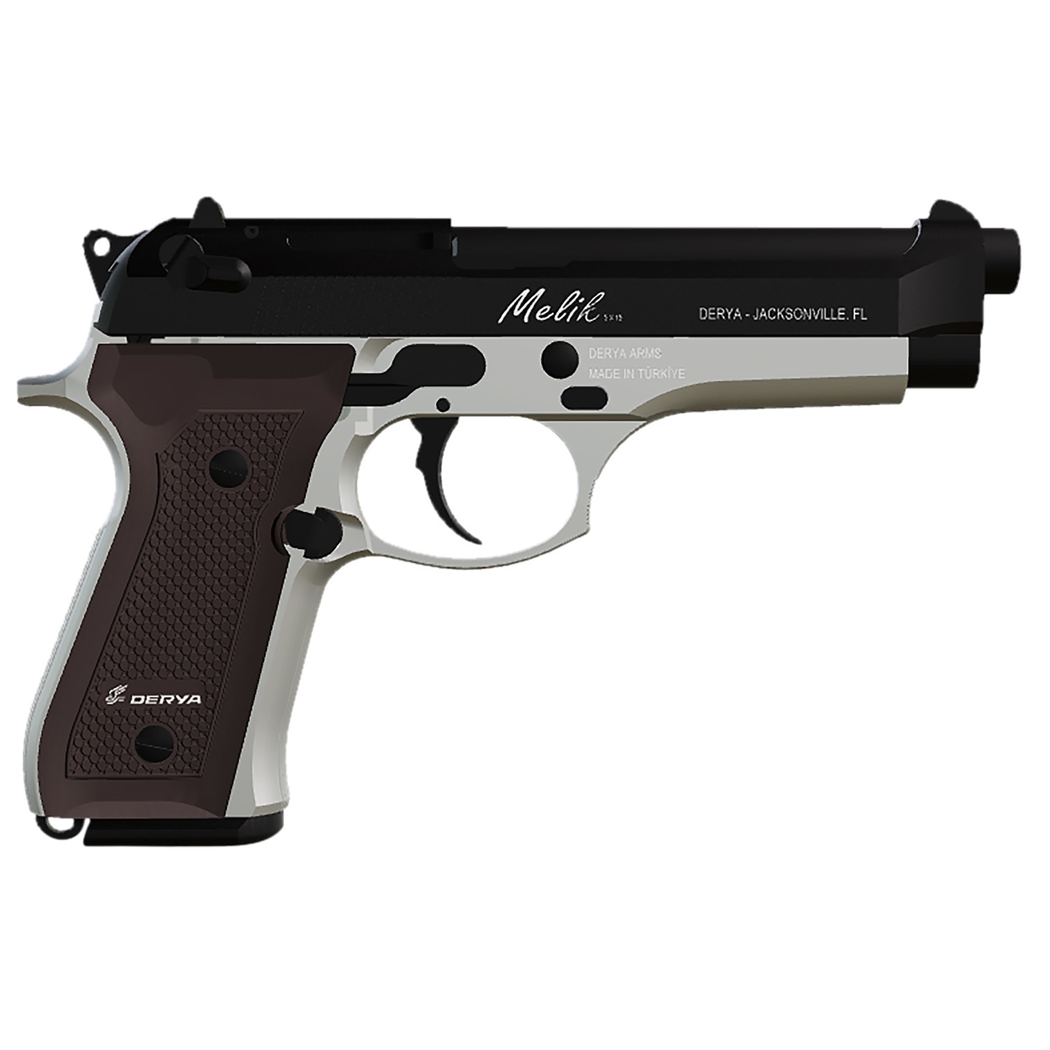 The Derya Melik 9mm pistol now features a two-tone finish with its silver aluminum frame contrasting against a black Melonite steel slide. The dark walnut grip provides a comfortable, ergonomic hold for the shooter. Designed with a double/single action and equipped with fixed sights for accuracy. Includes a hard case, user manual, WTTA flyer, high-capacity magazine, cleaning rod and gun brush.