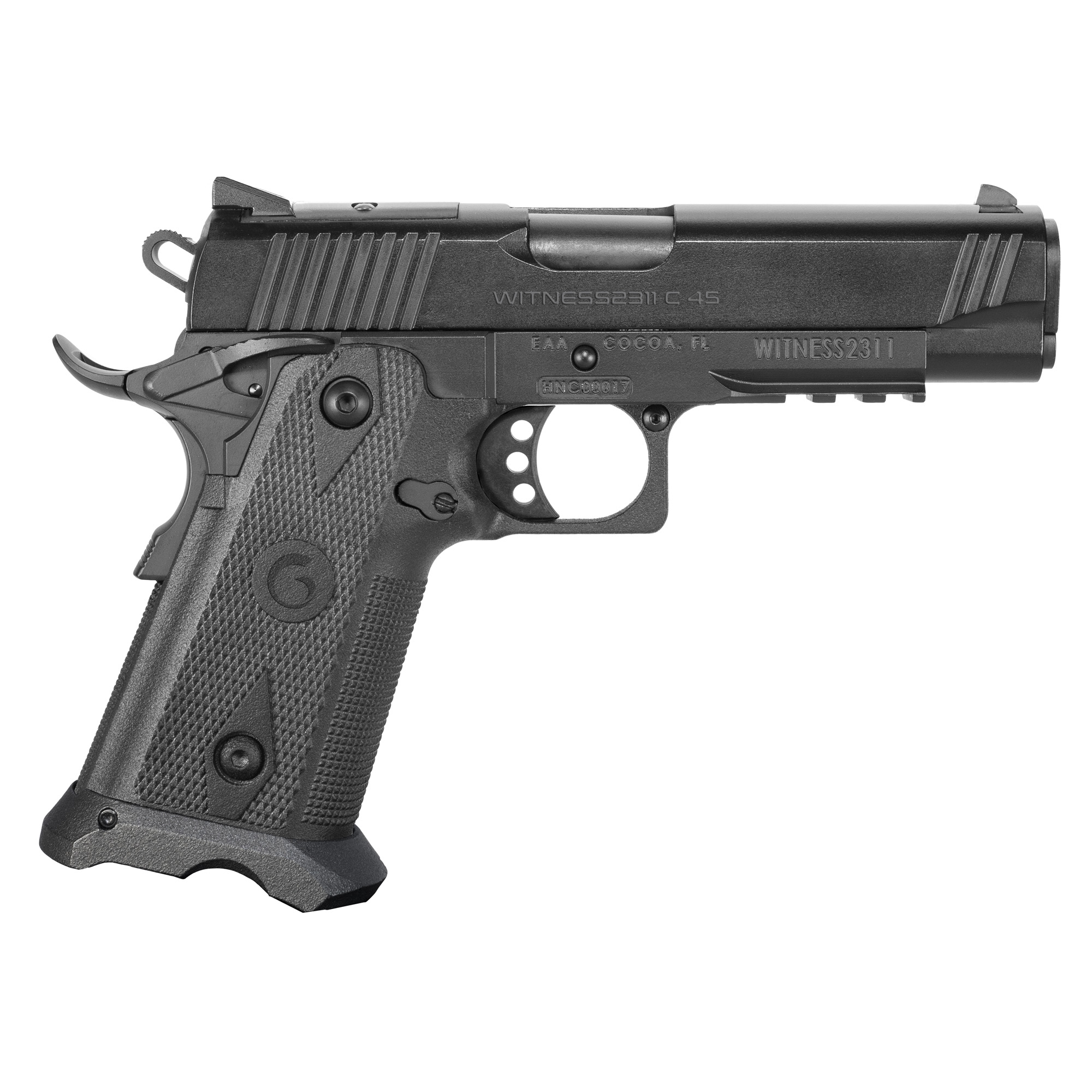 The Witness2311 is a double-stacked 1911 semi-automatic pistol that boasts a sleek design with ergonomic polymer grips; extended beavertail; accessory rail, skeletonized trigger; adjustable rear super sight and fiber optic front sight. Includes one magazine.
