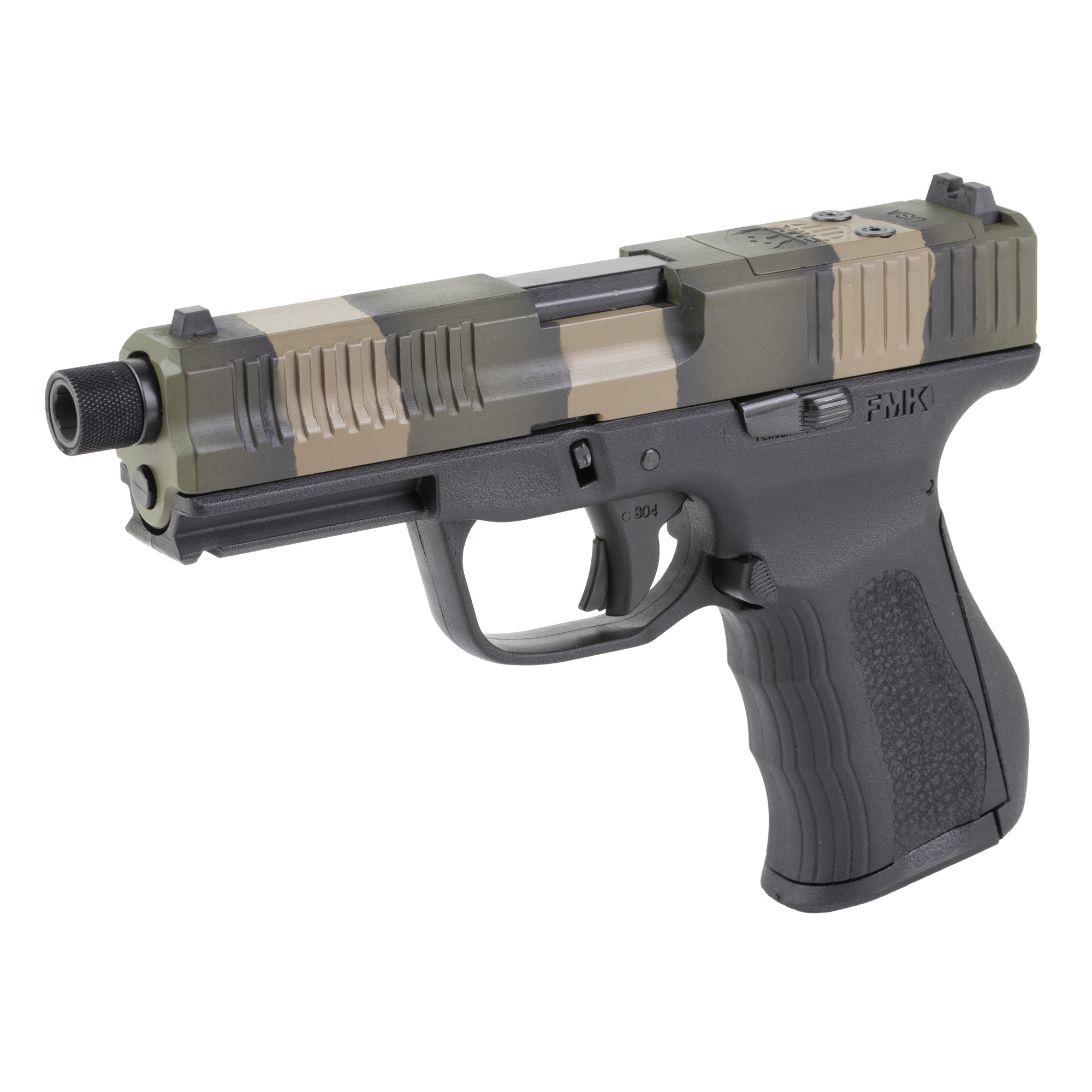 FMK Firearms, Gen 3, Striker Fired, Semi-automatic, Polymer Frame Pistol, Compact, 9mm, 4.5” Threaded Barrel, Optic Ready Slide, Textured Frame, Black, Cerakote Finish Camo Slide, Fixed Sights, 2 Magazines, (1)-17 Round and (1)-14 Round