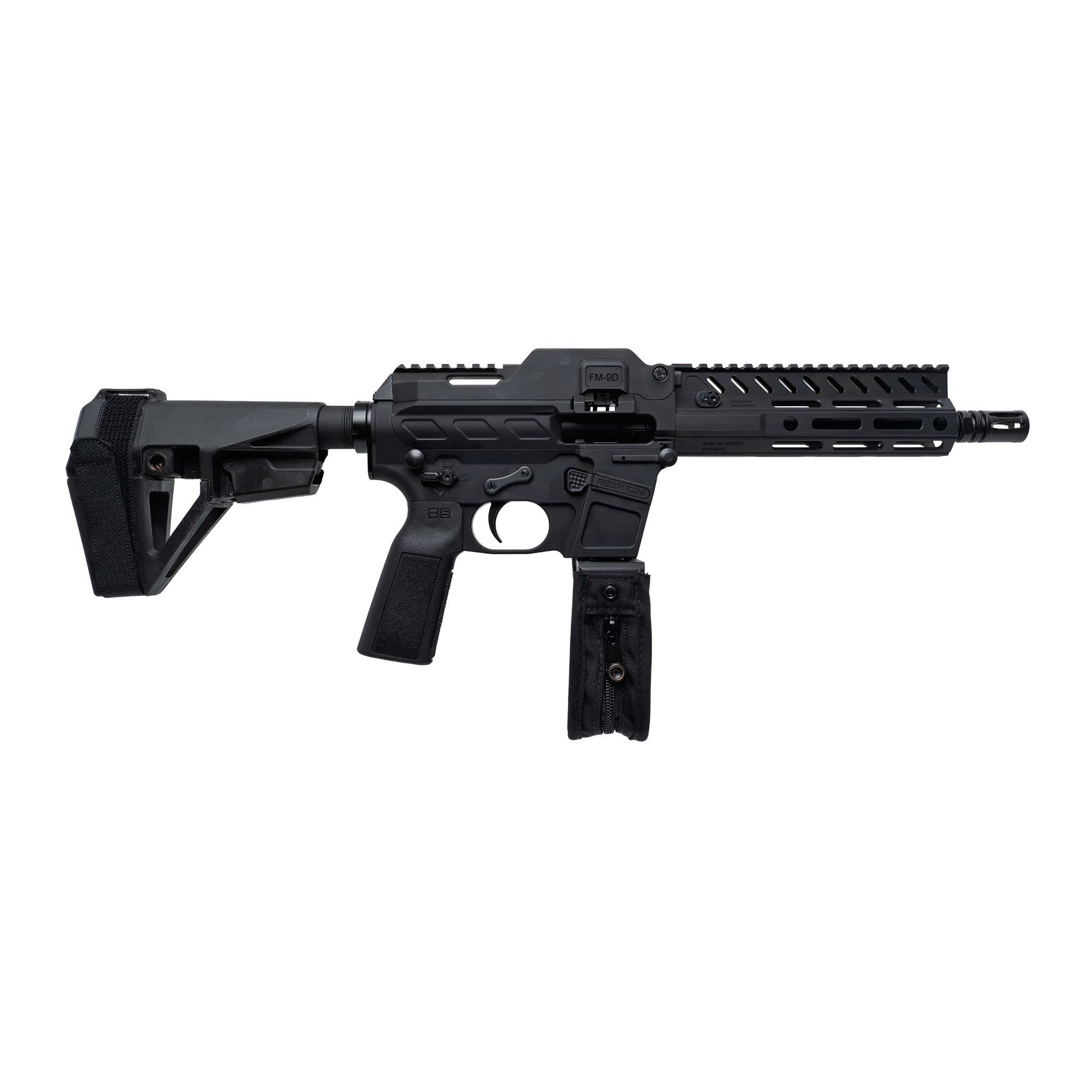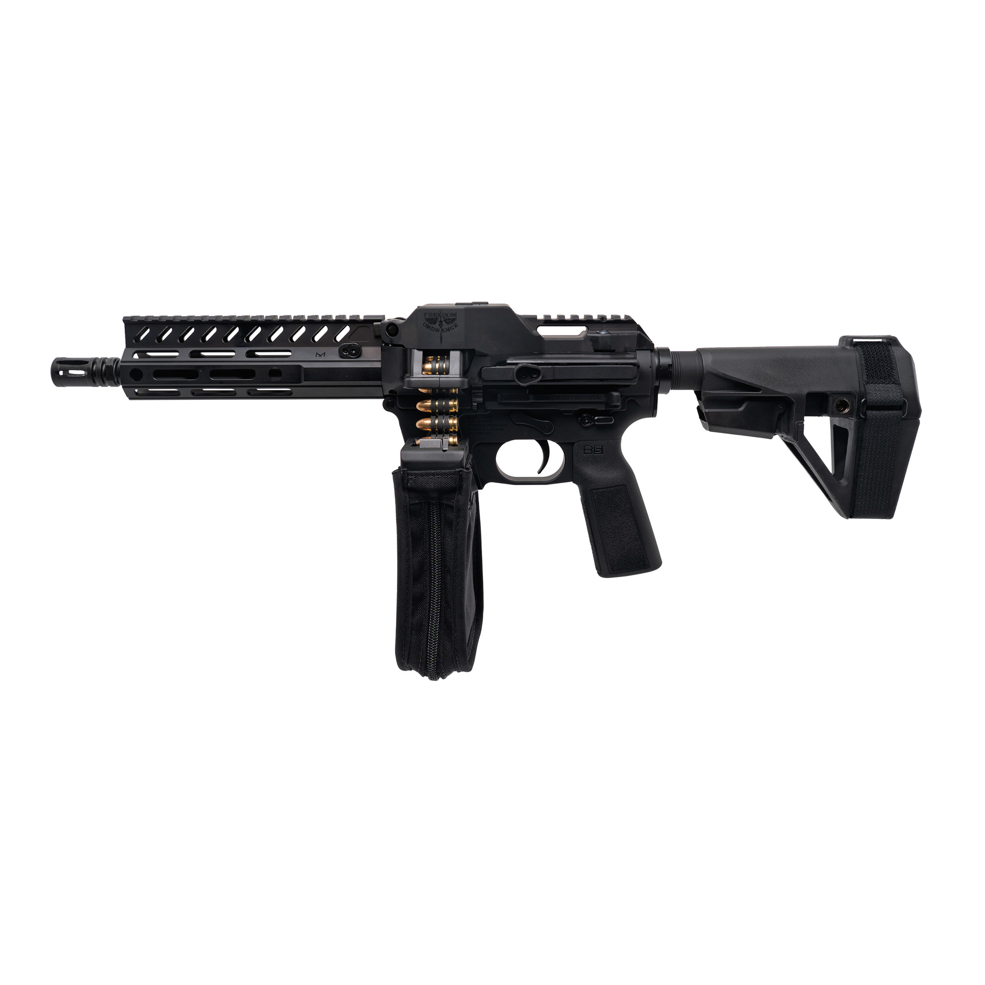 Freedom Ordnance, FM-9D, Semi-automatic, Belt Fed Pistol, 9MM, 8” Barrel, A2 Flash Hider, Anodized Finish, Black, Manual Safety, SBA5 Pistol Brace, M-LOK Handguard, 33 Rounds, 1 Glock Compatible Magazine, 150 Links, 100 Round Bag, Soft Case