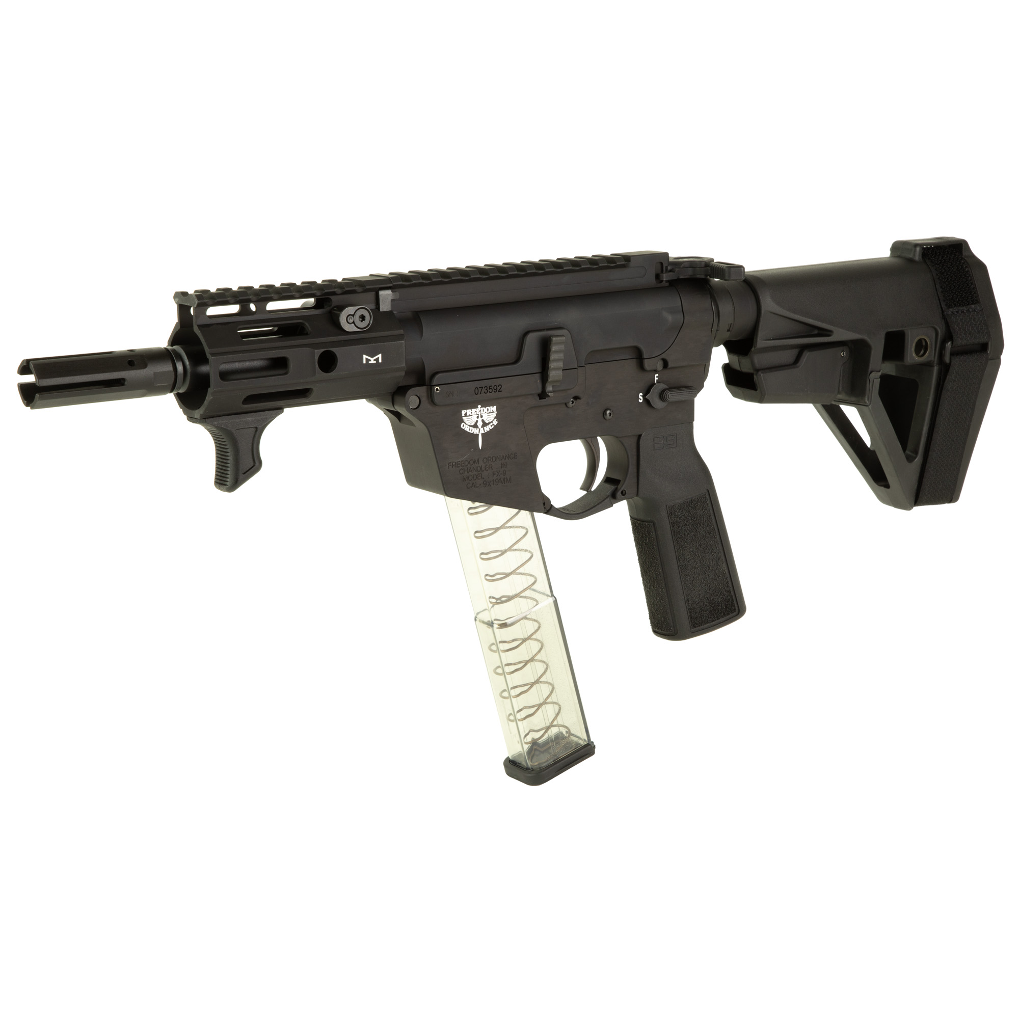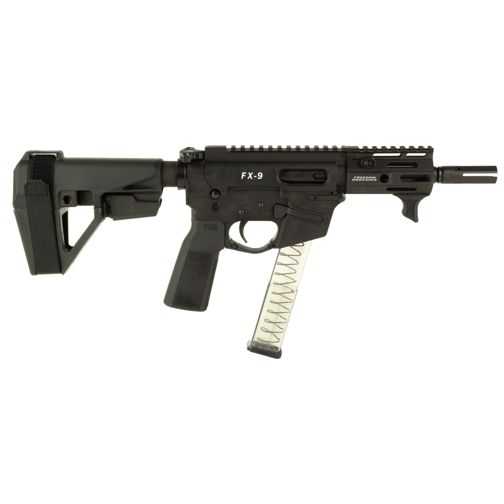 Freedom Ordnance, FX9 Elite, Semi-automatic, Pistol, 9MM, 4” Barrel, Flash Suppressor, Anodized Finish, Black, SBA5 Pistol Brace, BCM B5 Grip & Trigger Guard, Warhammer Ambidextrous Charging Handle, Finger Stop, 32 Rounds, 1 Magazine