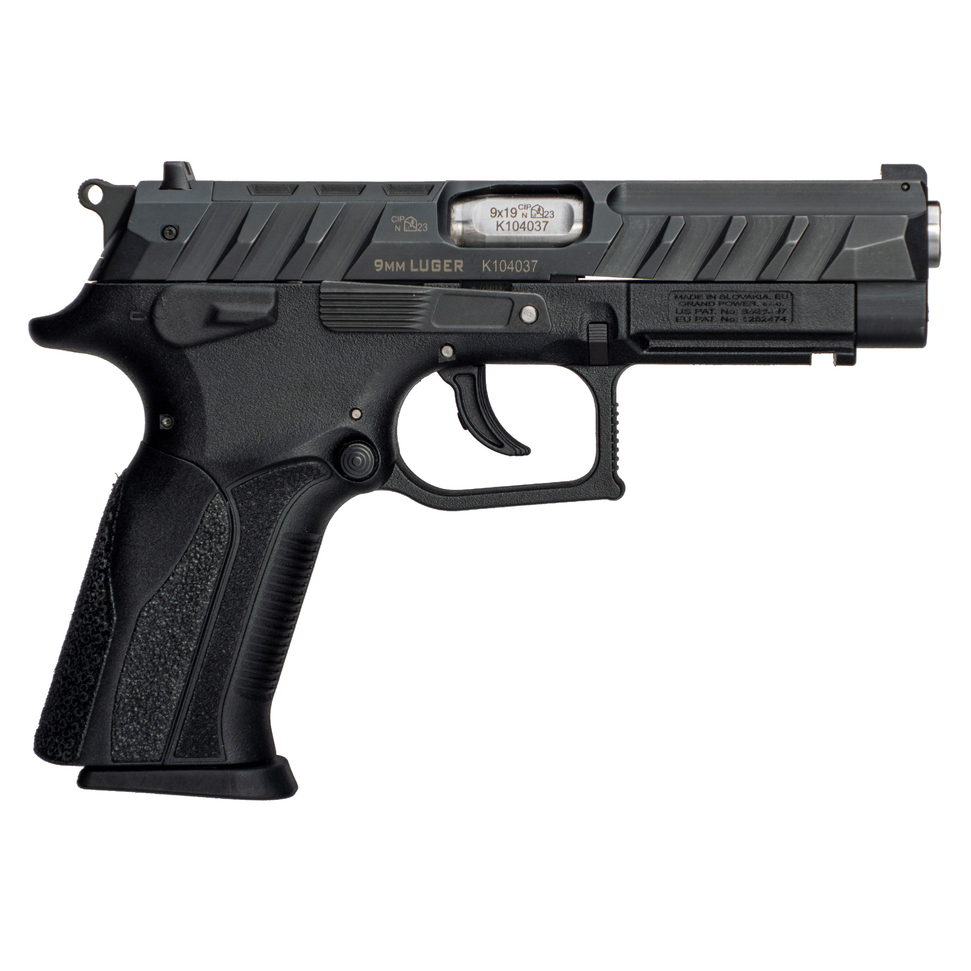 Grand Power, K100, Semi-automatic, Double Action/Single Action, Full Size, Polymer Frame Pistol, 4.25” Barrel, Manual Thumb Safety, Matte Finish, Black, 3-Dot Sights, Includes (4)-Optic Adapter Plates, 15 Rounds, 3 Magazines