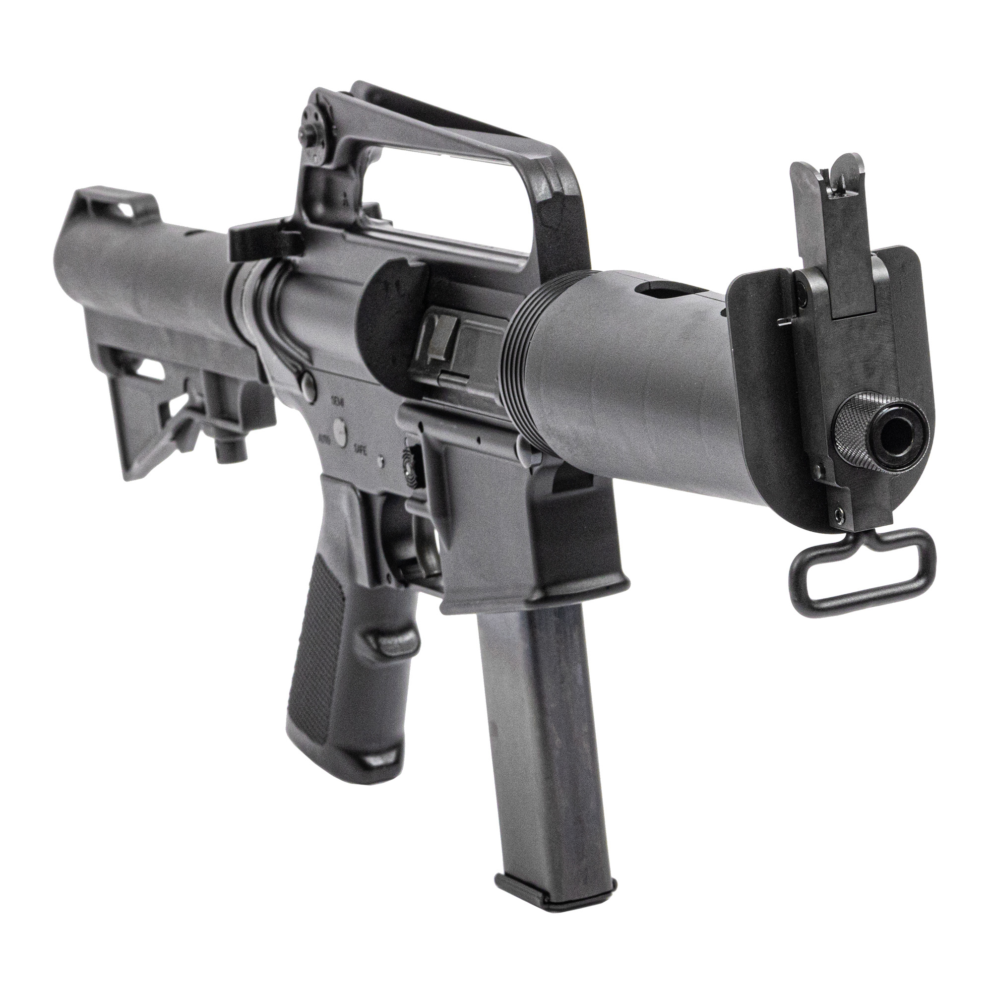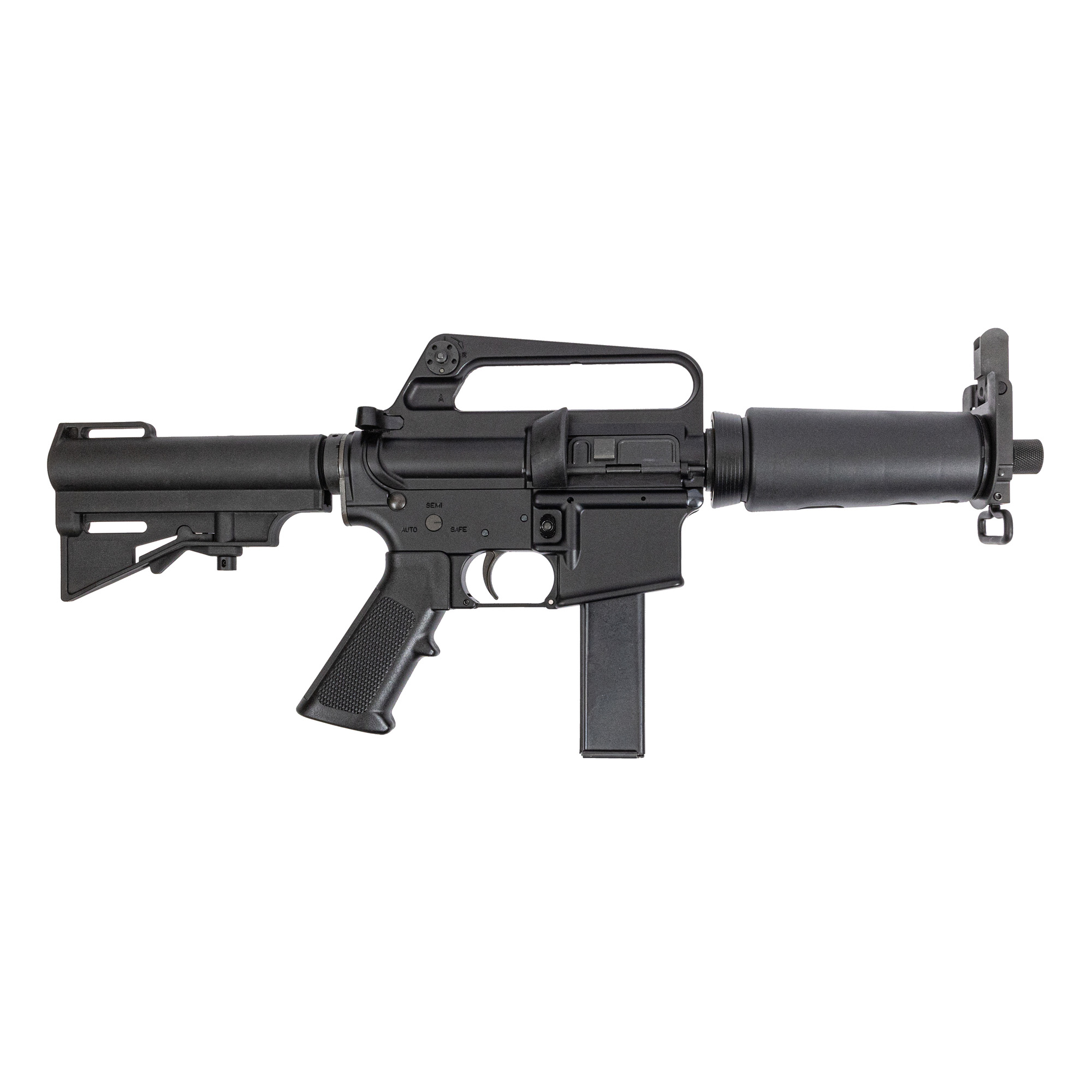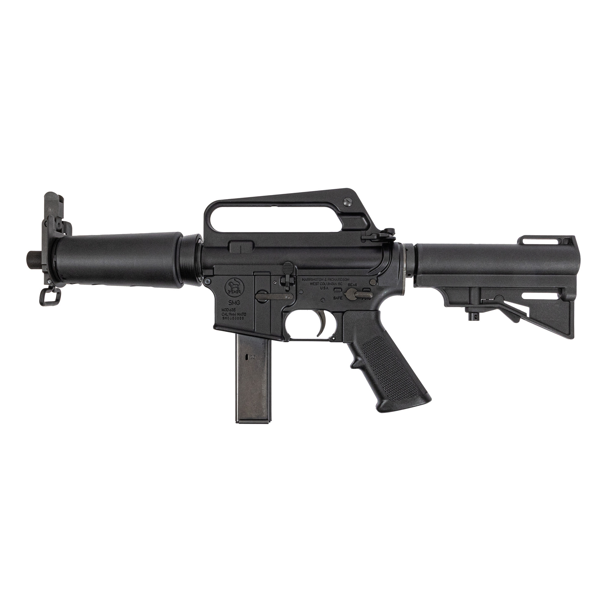 Harrington & Richardson, Retro DOE, Semi-automatic, Striker Fired, Aluminum Frame Pistol, 9MM, 7.5” Threaded Barrel, 5/8X24 Thread Pitch, Anodized Finish, Black, A2 Pistol Grip, HAR-15 Adjustable Pistol Brace, Carry Handle Iron Sights, Manual Safety, 20 Rounds, 1 Magazine, Includes Thread Protector