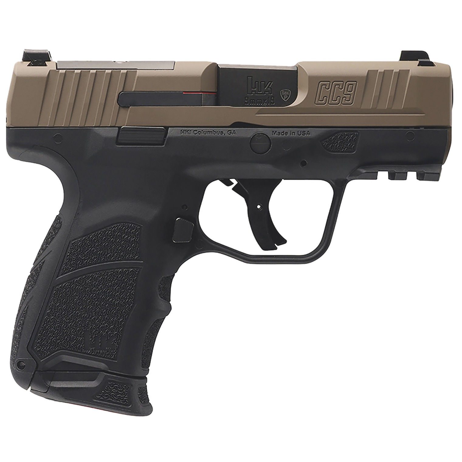 The CC9 is HKs smallest double-stack handgun. Its small features mirrored ambidextrous controls; picatinny-style rail; optics-ready slide; 5lb trigger has a crisp wall and reset; factory included night-sight and a grip with two interchangeable backstraps. Includes 10rd and 12rd magazine.