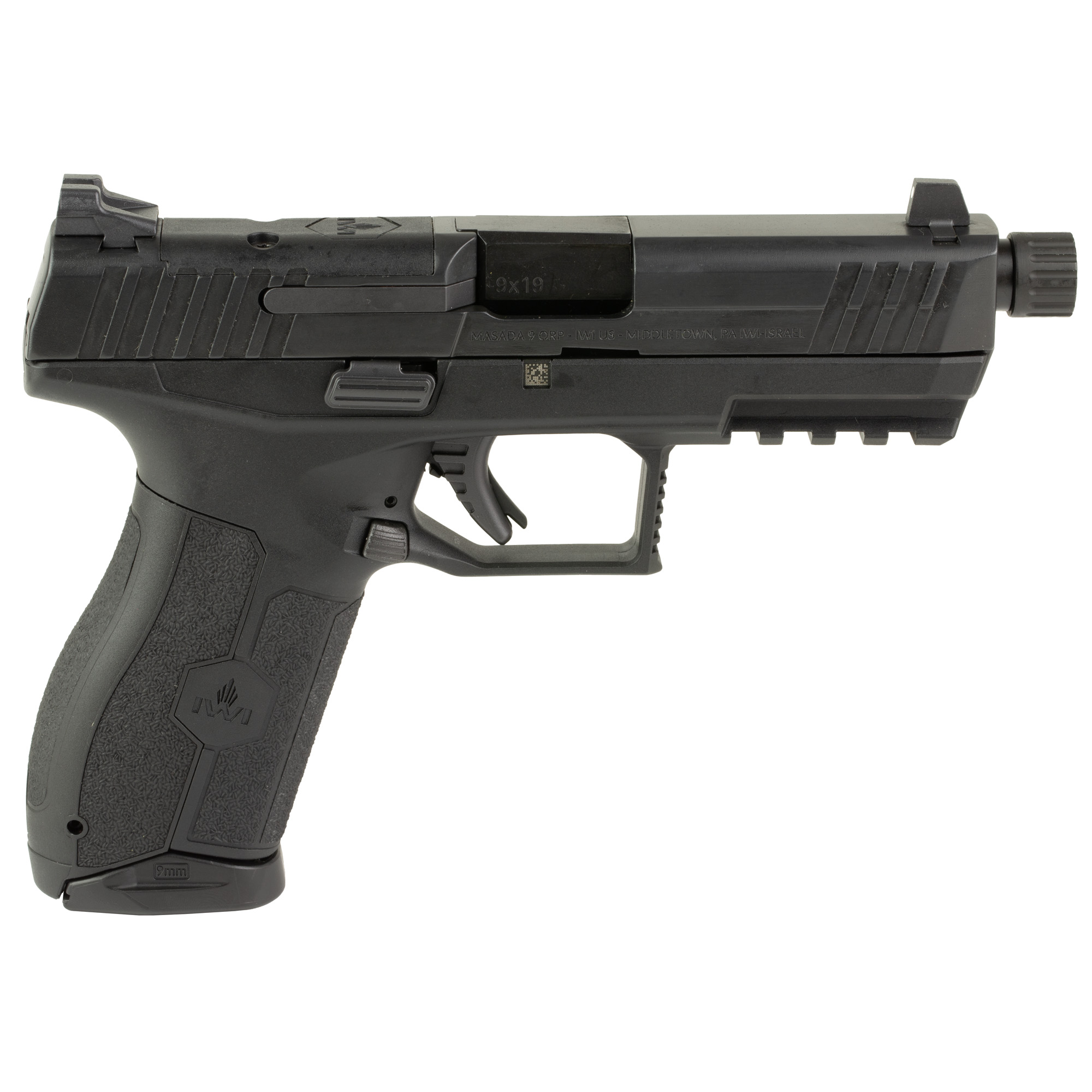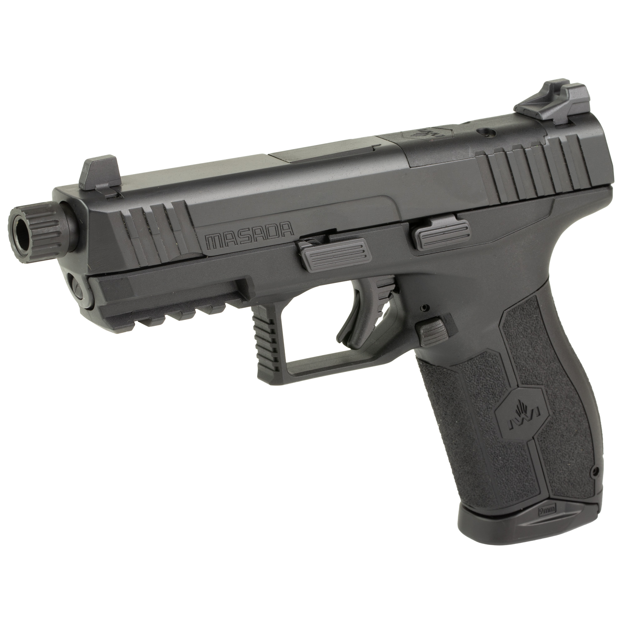 IWI MASADA polymer frame striker-fired pistol features a low profile threaded barrel for reduced perceived recoil; fully ambidextrous controls; enhanced ergonomics; deep beavertail; built-in trigger safety, the pistol will not fire unless the trigger is pulled; large trigger guard for use with or without gloves; enhanced grip texture which enables faster follow-up shots in all conditions and fully ambidextrous operating slide stop lever and magazine release. Includes two magazines, thread protector, four adapter plates (RMR, Venom, Delta Point and Romeo1) and three interchangeable wrap around back-straps.