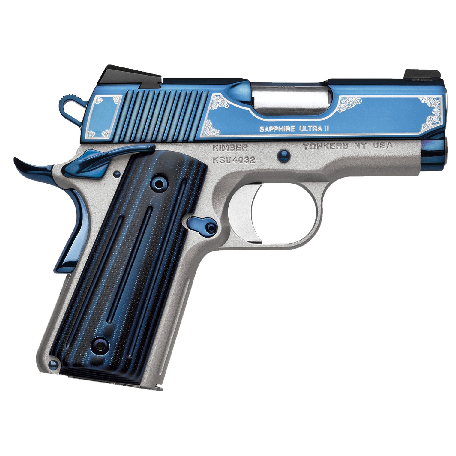 Kimber Mfg, Inc 3200273 Ultra II 9mm Luger 8+1 3” Stainless Match Grade Barrel, Engraved Sapphire Blue PVD Serrated Stainless Steel Slide, Satin Silver Aluminum Frame w/Beavertail, G10 Grip