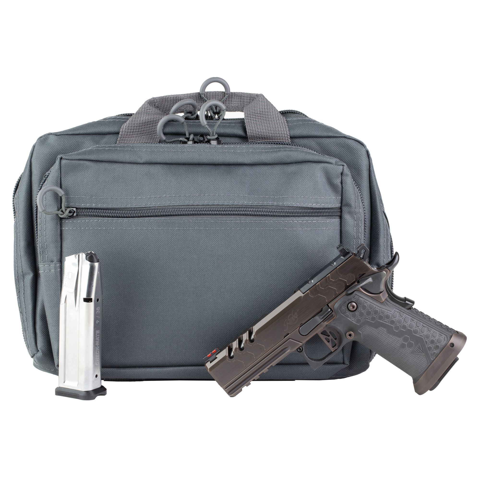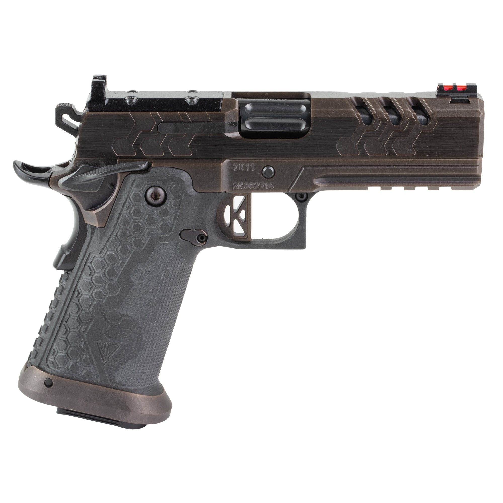 The Kimber 2K11 Pro with the patent pending tool-less guide rod, improved internal magazine geometry and external extractor and optics ready capability combine to deliver high capacity 1911 design. Featuring stainless steel slide, frame and barrel; accessory rail; Custom 2K11 front and rear serrations on slide; MJD composite grip module; MJD magwell; TAG Custom FiberLok 2 front sights and a fluted, crowned barrel. Includes a C&H Precision optics plate for the Trijicon RMR family, two 19rd magazines.