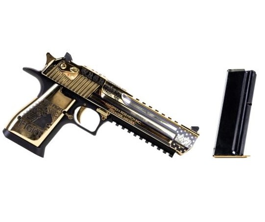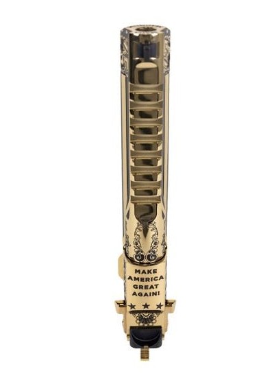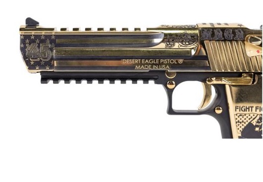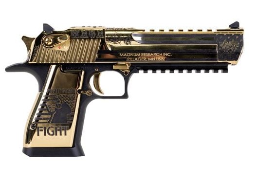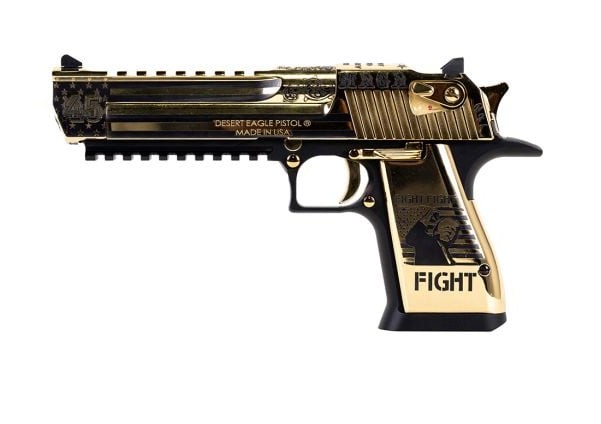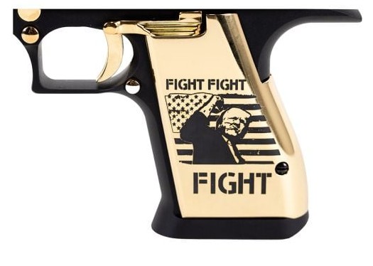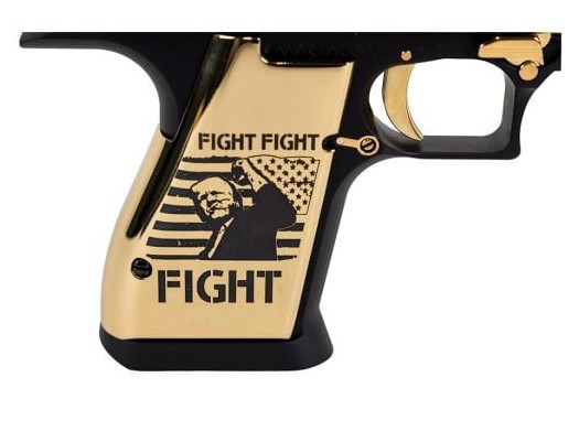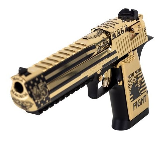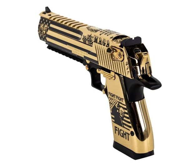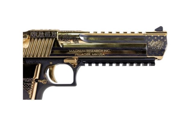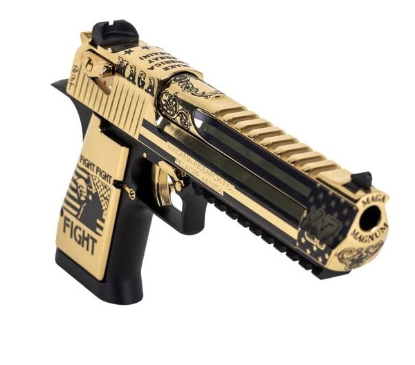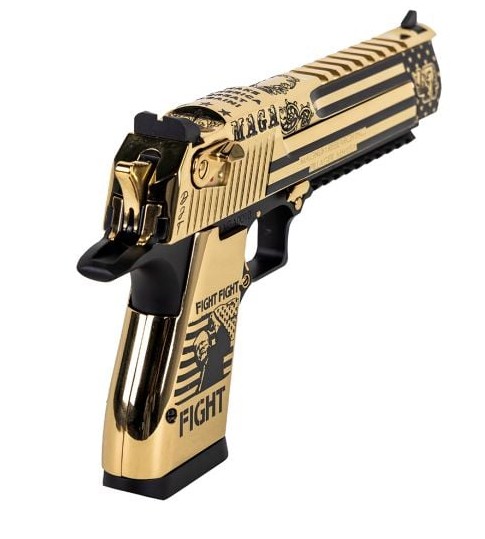 The firearm features ‘MAGA MAGNUM’ engraved near the muzzle, along with a stars and stripes motif on the slide. The numbers ‘45’ and ‘47’ are also engraved, referencing Trump’s past and potential future presidential terms. The grips are engraved with the phrase ‘Fight, Fight, Fight!’ and an image of Donald Trump. The pistol has a Premium PVD TiN gold coating with blackened engravings and a clear Cerakote finish.