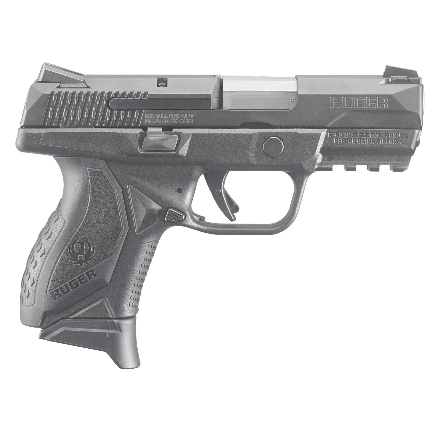 Ruger’s American Compact pistol has a pre-tensioned striker system that features a powerful striker spring for positive ignition without a heavier trigger pull. It has a rigid, one-piece, precision-machined, black nitrided, stainless steel chassis with integral frame rails and fire control housing. Its modular wrap-around grip system is for the adjustment of palm swell and trigger reach to fit a wide range of hand sizes. Ergonomic grip modules lock in solidly and do not loosen. The American Duty also features Novak LoMount Carry three-dot sights, ambidextrous slide stop and magazine release, Picatinny rail, and non-slip surfaces on its side and grip.