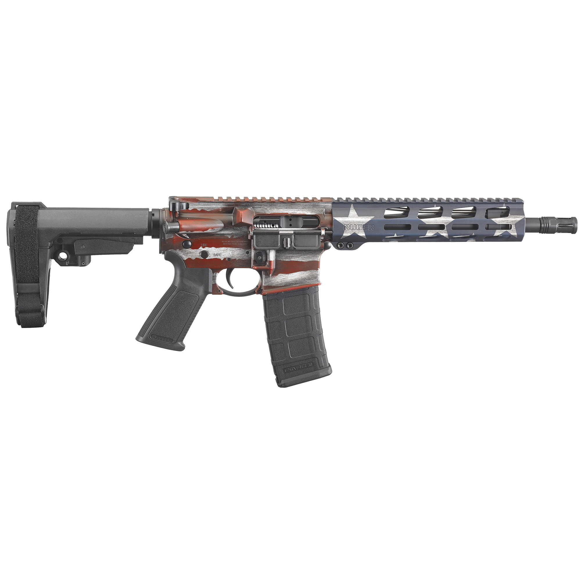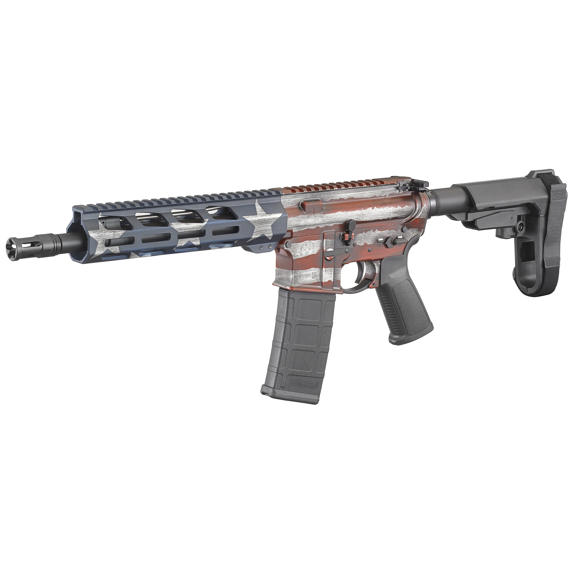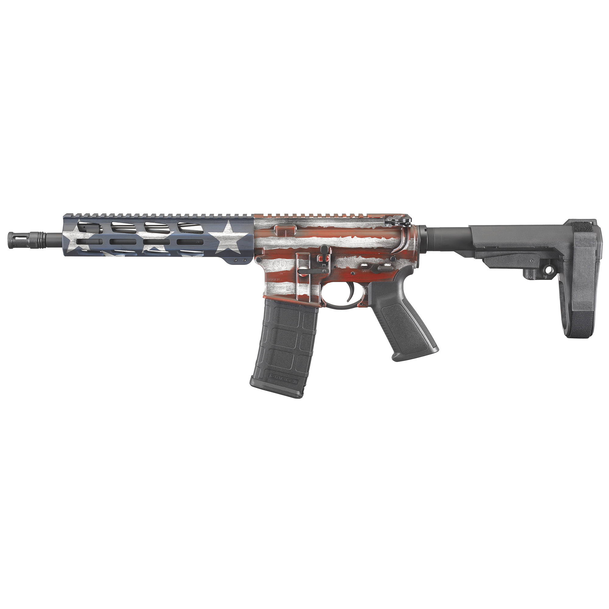 Ruger, AR-556 AR15 Pistol, Semi-automatic, AR, 223 Remington/556NATO, 10.5” Cold Hammer Forged Barrel, Threaded, Aluminum Receiver, American Flag Cerakote Finish, SBA3 Brace, 30Rd, 1 Mag, MLOK Handguard, Weighs 6.2lb