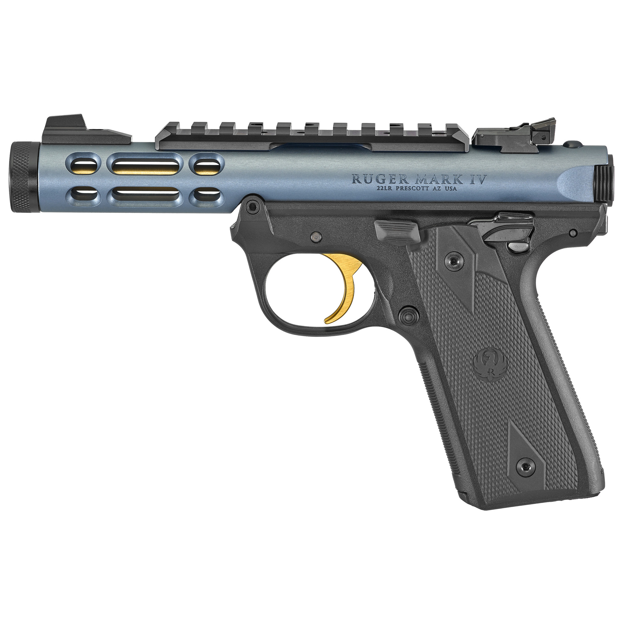 The Mark IV features a simple, one-button takedown for quick and easy field-stripping. Features a lightweight, ventilated, aerospace-grade aluminum receiver and a tensioned stainless steel barrel; contoured ejection port; an adjustable rear sight and a factory-installed Picatinny rail for easy mounting of optics; ambidextrous manual safety can be converted to left-side only with included washer; conveniently located push-button magazine release on the left side of the frame; Includes two magazines.