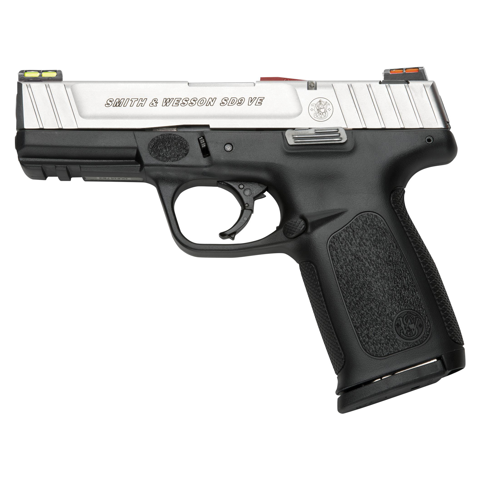 The S&W SDVE pistol features a polymer frame; stainless steel slide and barrel; SDT- Self Defense Trigger for optimal, consistent pull from first round to last; Dovetailed, white dot sights; Tactile Loaded Chamber Indicator; ergonomic, textured grip; aggressive front and back strap texturing; Picatinny style rail and textured finger locator on frame for same hand-hold each time. Includes 2 magazines.