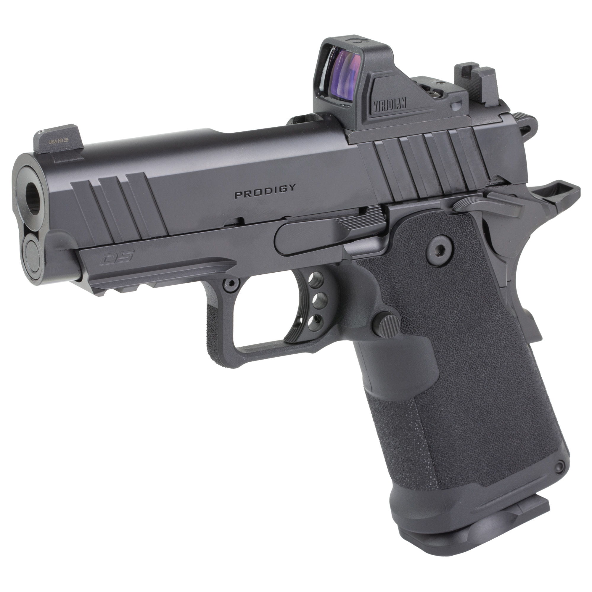 The Prodigy from Springfield Armory takes the proven 1911 platform and enhances it with double-stack capacity and a performance-driven feature set. Reconfigured around a double-stack magazine, the Prodigy’s polymer grip module mounts to its forged steel frame offering a capacity of 15rds. The Gear Pac includes a Viridian RFX11 green dot optic, four magazines and a pistol bag.