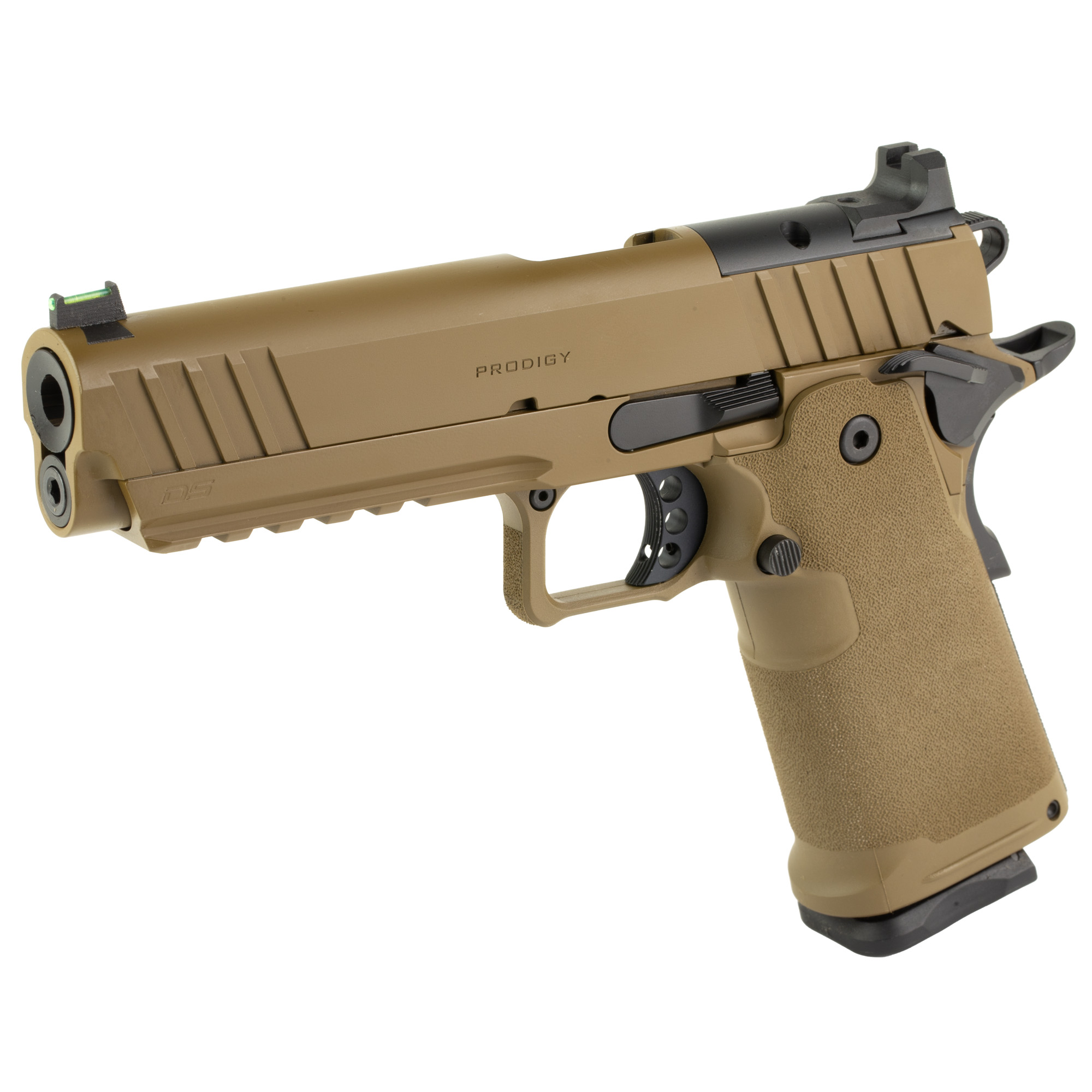 Springfield, 1911 DS Prodigy AOS, Semi-automatic, Metal Frame Pistol, 9MM, 5” Forged Stainless Steel Bull Barrel, Cerakote Finish, Coyote Brown, Polymer Grips, Fiber Optic Front and Black Serrated Rear Sights, Optics Ready, Ambidextrous Safety, 10 Rounds, 2 Magazines