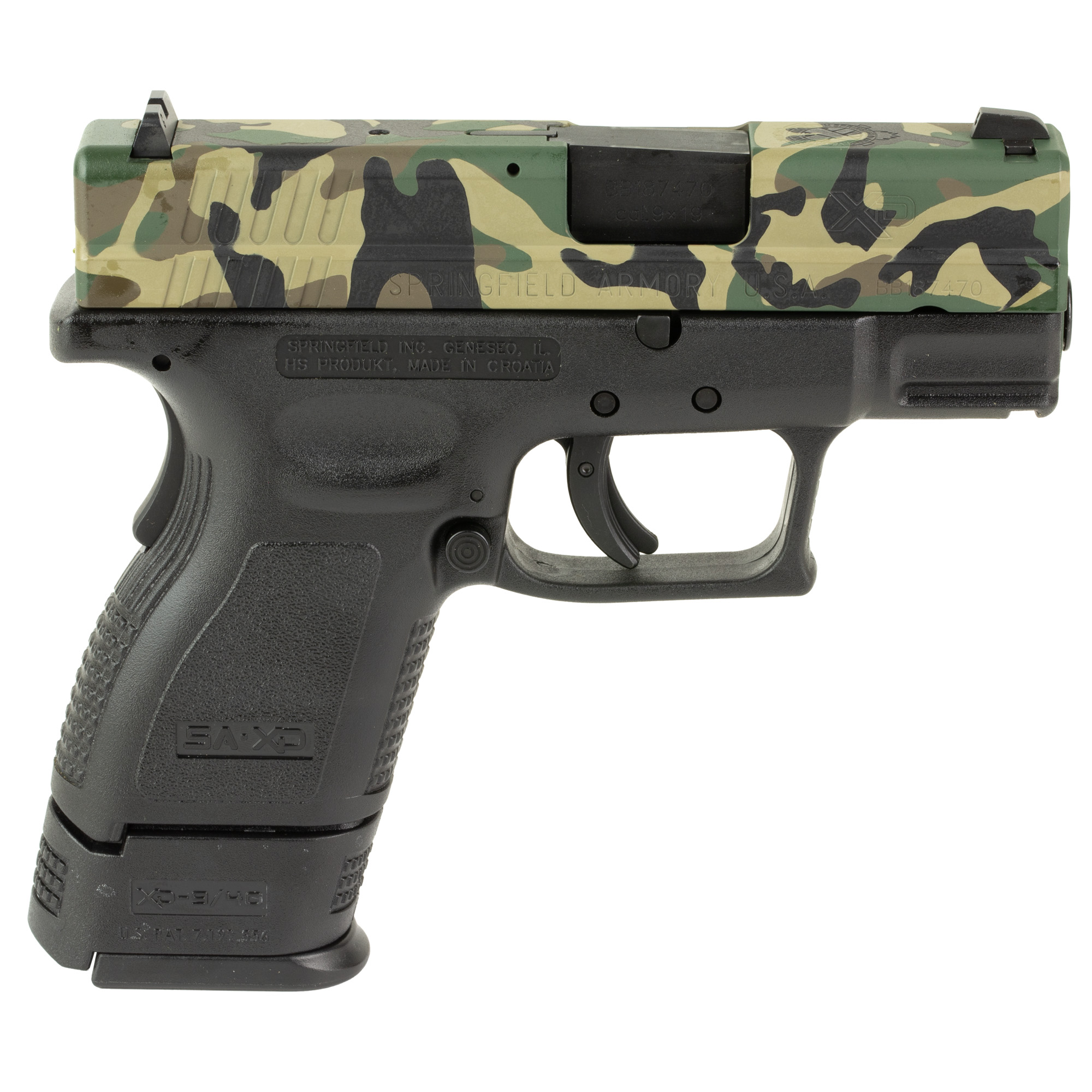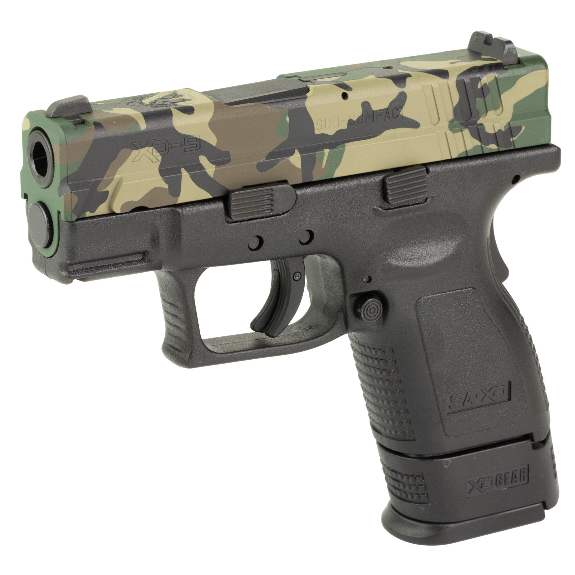 Springfield, XD, Semi-automatic, Striker Fired, Sub-Compact, 9MM, 3”, Custom M81 Woodland Camo Cerakote Finish Slide by Shark Coast Tactical, Black Frame, (1)-16 Round Magazine, (1)-13 Round Magazine With Grip Extension, Right Hand, Fixed Sights, Polymer, Melonite