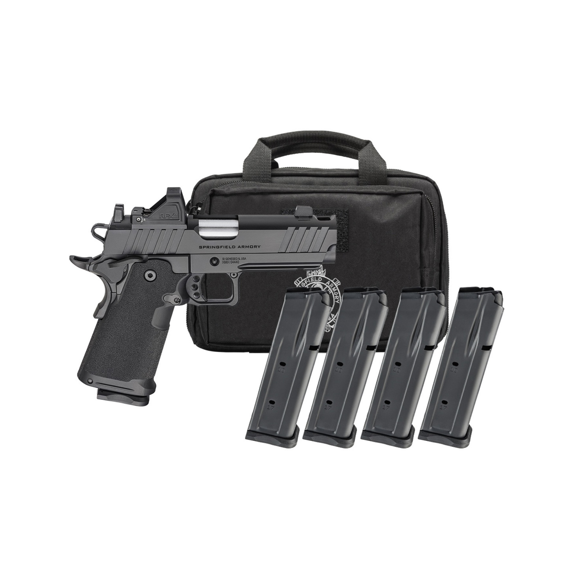 The Prodigy Comp 4.25” takes the proven 1911 platform and enhances it with double-stack capacity and a performance-driven feature set. Reconfigured around a double-stack magazine, the polymer grip module mounts to a forged steel frame, offering capacities of 17+1 and 20+1. The 4.25” AOS-compatible slide and barrel assembly is integrally compensated to reduce muzzle rise, while a Picatinny rail is ready to accept today’s most popular accessories. The Prodigy Comp 4.25 combines the most beloved characteristics of the 1911 with modern capacity for unrivaled performance. The Gear Pac includes a Viridian RFX11 green dot optic, four magazines and a pistol bag.