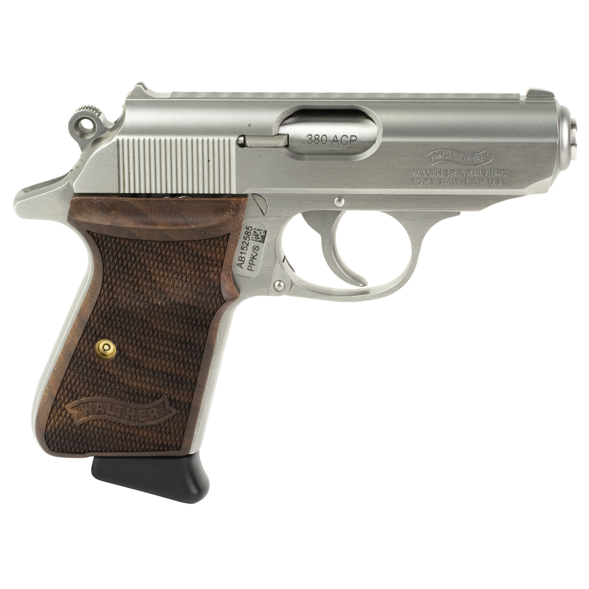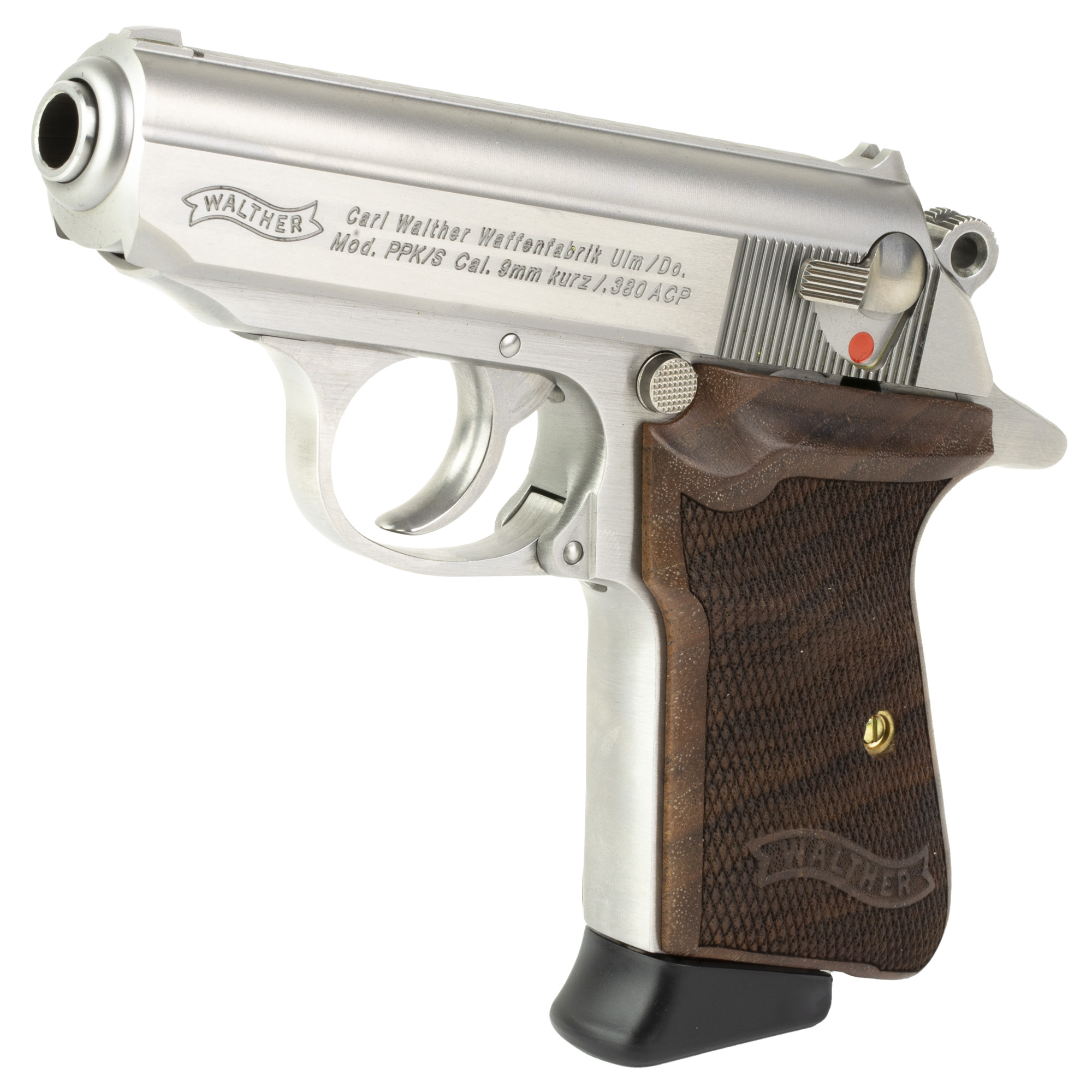 Walther, PPK/S, Semi-automatic, Metal Frame Pistol, Compact, 380ACP, 3.3” Barrel, Steel, Stainless, Walnut Grips, Fixed Sights, 7 Rounds, 2 Magazines