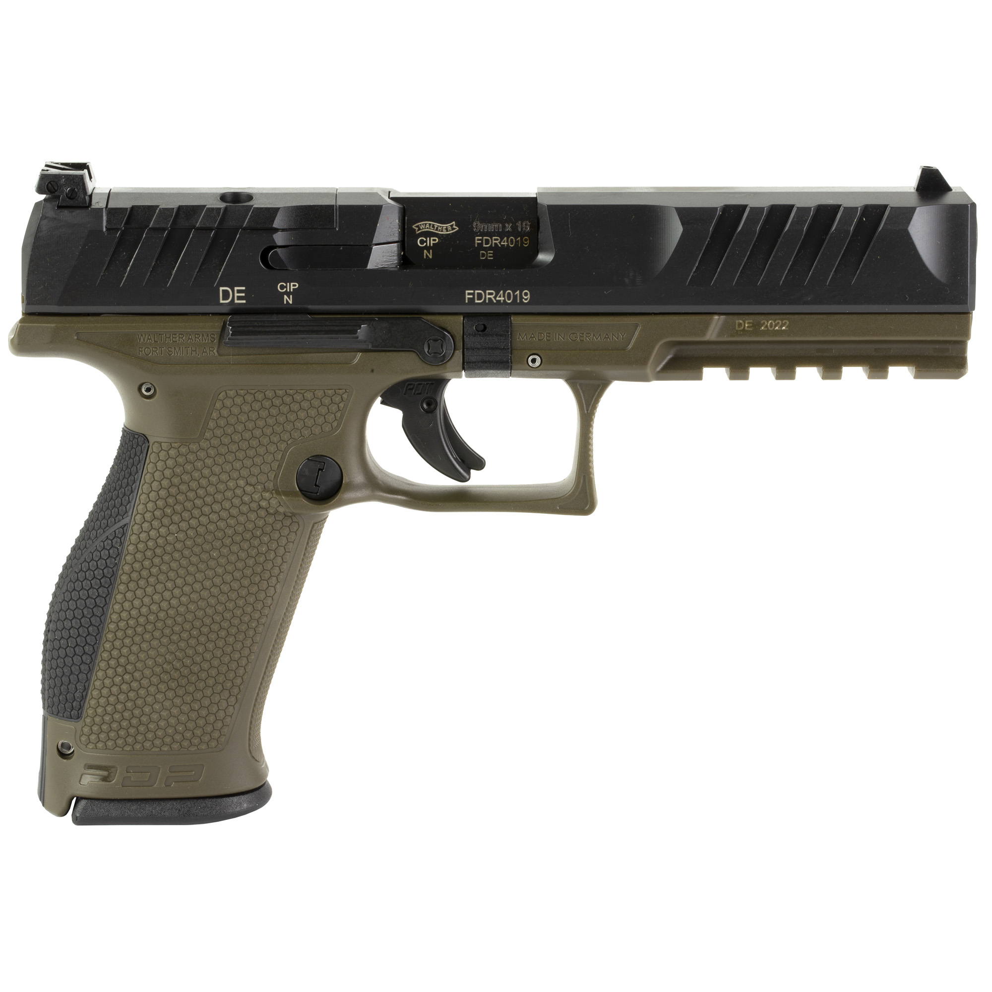 The Walther PDP handgun is for whether you are on the job or with the family. Featuring revolutionary ergonomics, SuperTerrain Slide Serrations and a Performance Duty Trigger. The SuperTerrain Serrations are uniquely designed protruding serrations on the slide, allowing for quicker and more responsive hands-on engagement with the pistol. Performance Duty Texture provides an aggressive surface to maintain proper grip performance. With its tetrahedron design, it is non-abrasive so there will be no irritation to the skin or clothing of the user. Includes two magazines.