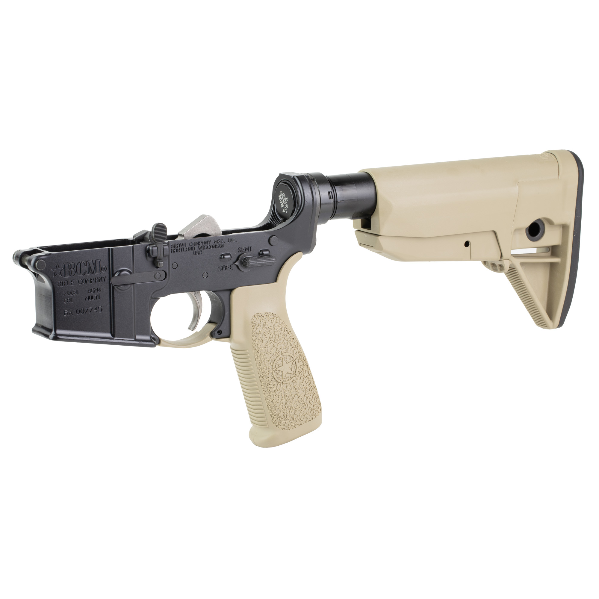 Bravo Company, Complete Lower Receiver, AR-15, Multi Caliber, Anodized Finish, Flat Dark Earth, BCM MK2 Recoil Mitigation System, BCM MOD 0 Stock, 7075 T6 Aluminum, Factory Cosmetic Blem