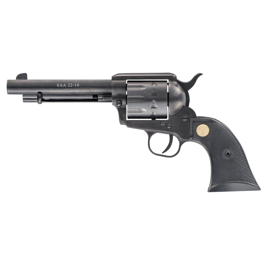 A 10-shot version of the classic Single Action in caliber .22LR. One of the most accurate reproductions of the 1873 Single Action. While maintaining the true to form classic design, this Single Action revolver is a hybrid of modern technology and manufacturing with the feel of the Old West. This revolver is crafted with a steel rifled barrel and cylinder, alloy frame, black plastic grips and fixed sights.