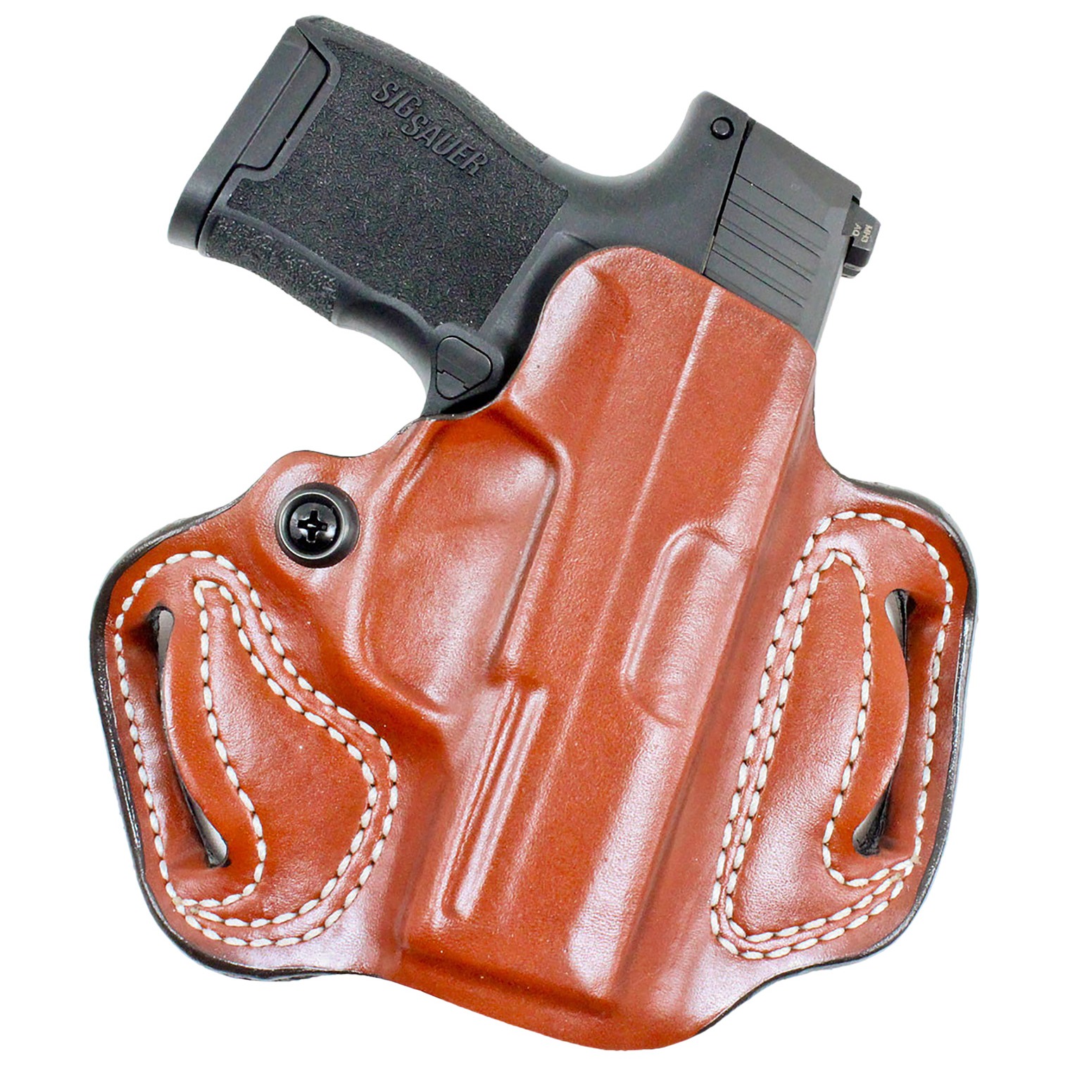The Mini Slide is a premium saddle leather, double seams and a highly detailed molded fit, make this exposed muzzle, tight fitting, two-slot holster a great choice for pistols. It features an adjustable-tension device. Available in black or tan unlined leather. Belt slots are 1 3/4” wide.