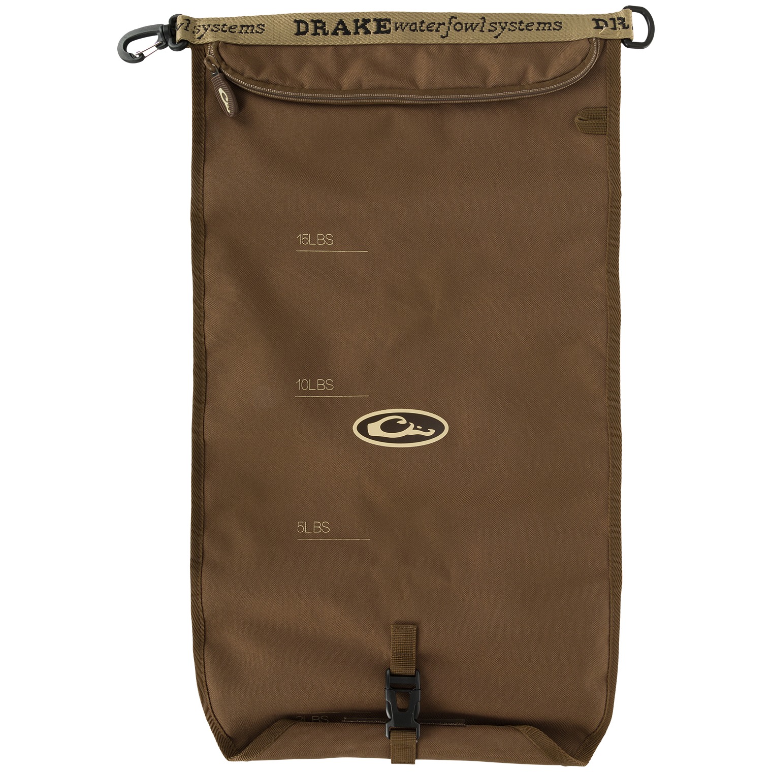 The gun dog travel food bag, a large zippered opening at the top for easy loading and unloading of dog food. Graduated lines for easy measurement. Roll-up dispenser with Velcro and buckle closure allows for easy flow and secure closure. Buckle clips at the top allow for hanging storage or hands-free dispensing of food. 600D Polyester with PEVA laminated lining, polyethylene board for structure.